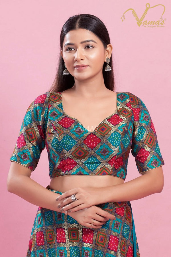 Make a regal statement this wedding season with this exquisite blouse, showcasing gota work embroidery in a striking zig-zag pattern on vibrant multi-colored print fabric, complemented by a stylish paan...
