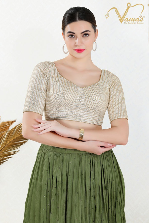 Vamas Women's Net Padded Back Open Elbow Sleeves Saree Blouse, This Is A Fully Stitched Ready-Made Padded Saree Blouse With Elbow Sleeves, Size Tip: We recommend buying a size bigger...