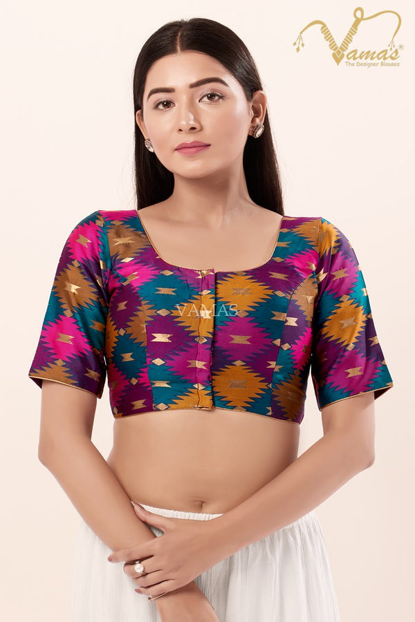 Step out in this distinctive printed blouse showcasing a vibrant ethnic motif. The elegant paan neckline complements the graceful elbow sleeves. Designed with a waist yoke to accentuate your figure beautifully.,...
