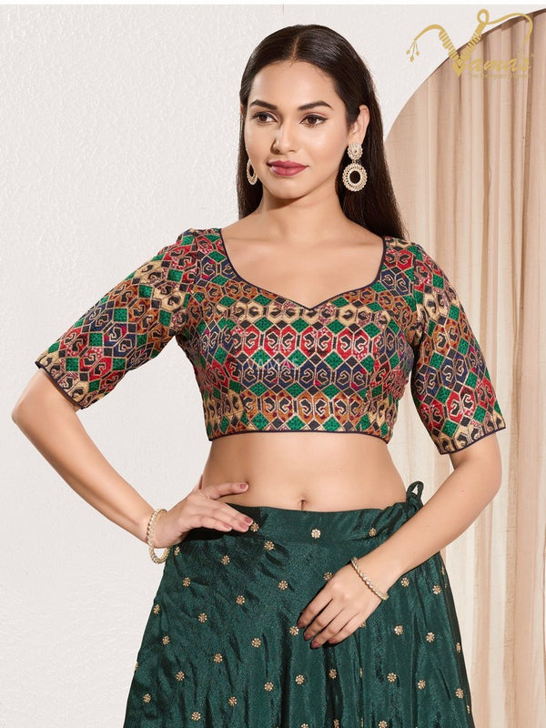 Embrace tradition with this vibrant multi-colored saree blouse crafted from rich jacquard fabric. The unique overlap pattern, coupled with a defined yoke at the waist, adds a touch of classic...