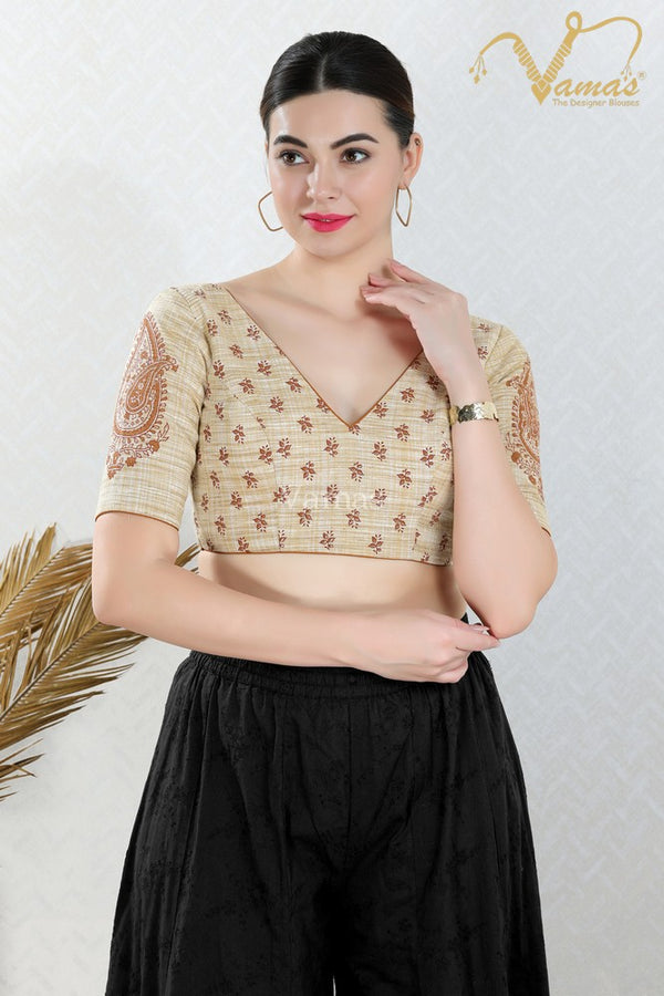 Vamas Women's Jacquard Non-Padded Stretchable Elbow Sleeves Saree Blouse This is a fully stitched stretchable lycra blead blouse/ crop top. Size Tip: With Stretchable Fabric, M works well for size...