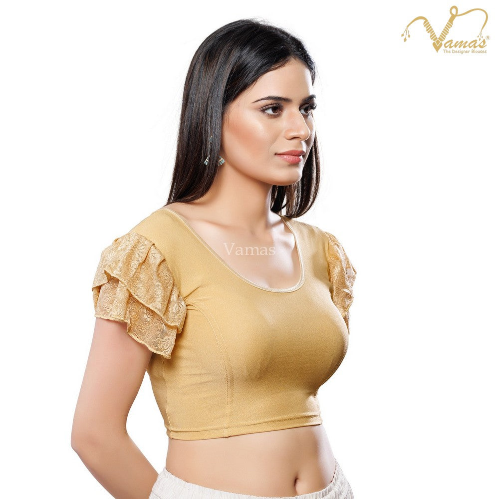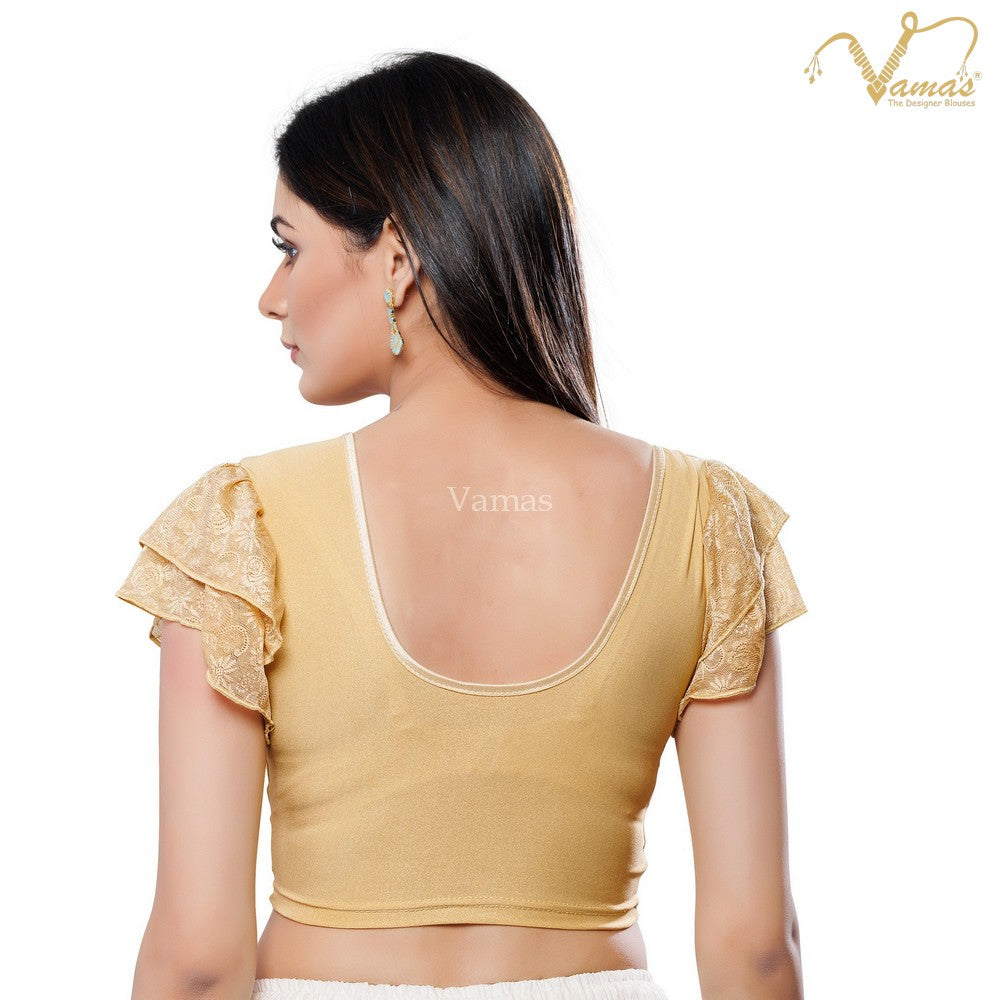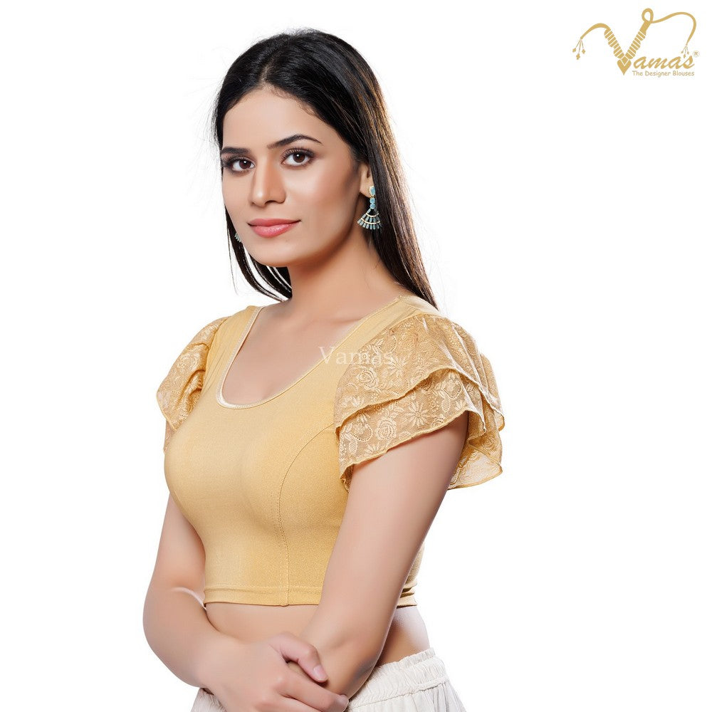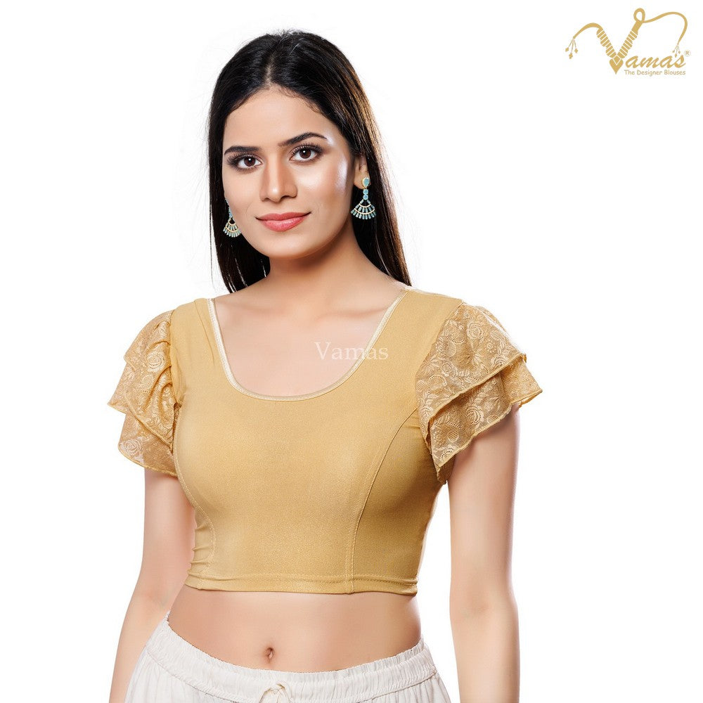 A stunning ruffle sleeve blouse made in lycra shimmer fabric and net sleeves., This is a fully stitched stretchable lycra blead blouse/ crop top., Size Tip: With Stretchable Fabric, M works well for size 32 and 34, L for 36 and 38, XL for 40, XXL for 42 and XXXL for 44., Can stretch upto 2 sizes., Care Instruction : Dry Clean Only.