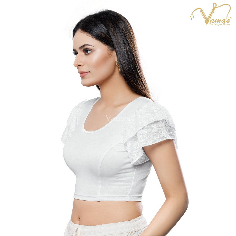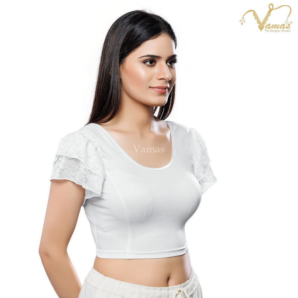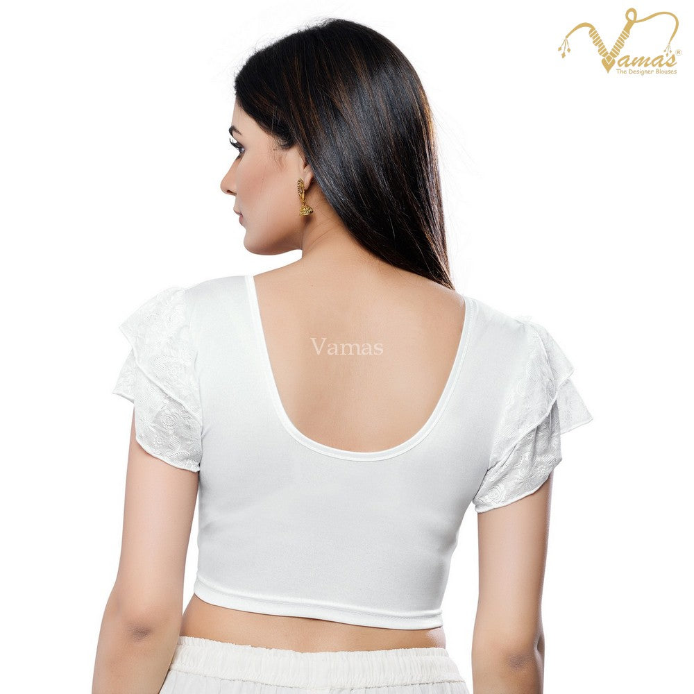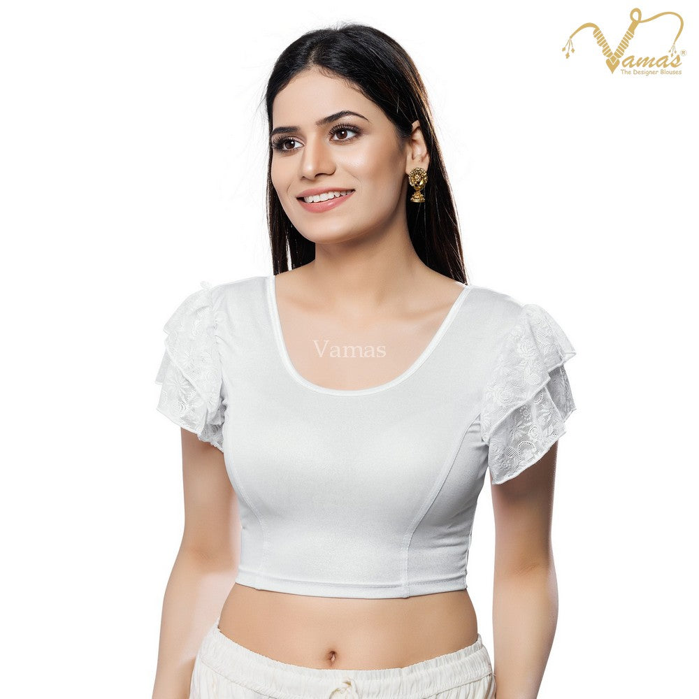 A stunning ruffle sleeve blouse made in lycra shimmer fabric and net sleeves., This is a fully stitched stretchable lycra blead blouse/ crop top., Size Tip: With Stretchable Fabric, M works well for size 32 and 34, L for 36 and 38, XL for 40, XXL for 42 and XXXL for 44., Can stretch upto 2 sizes., Care Instruction : Dry Clean Only.