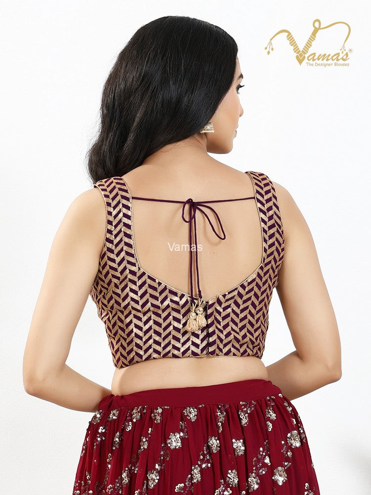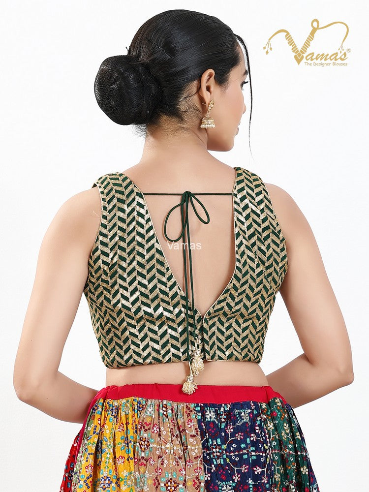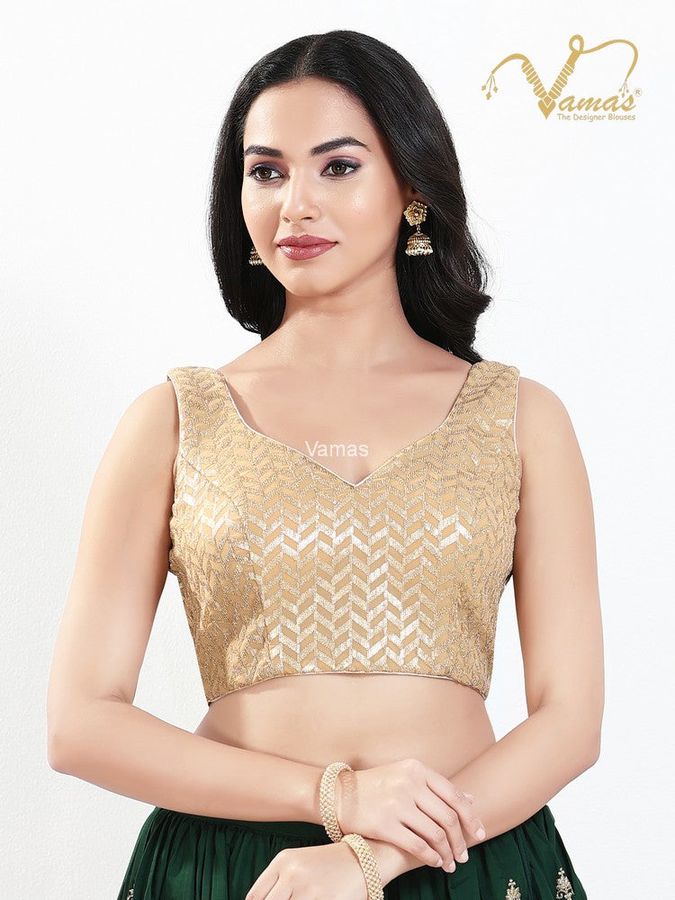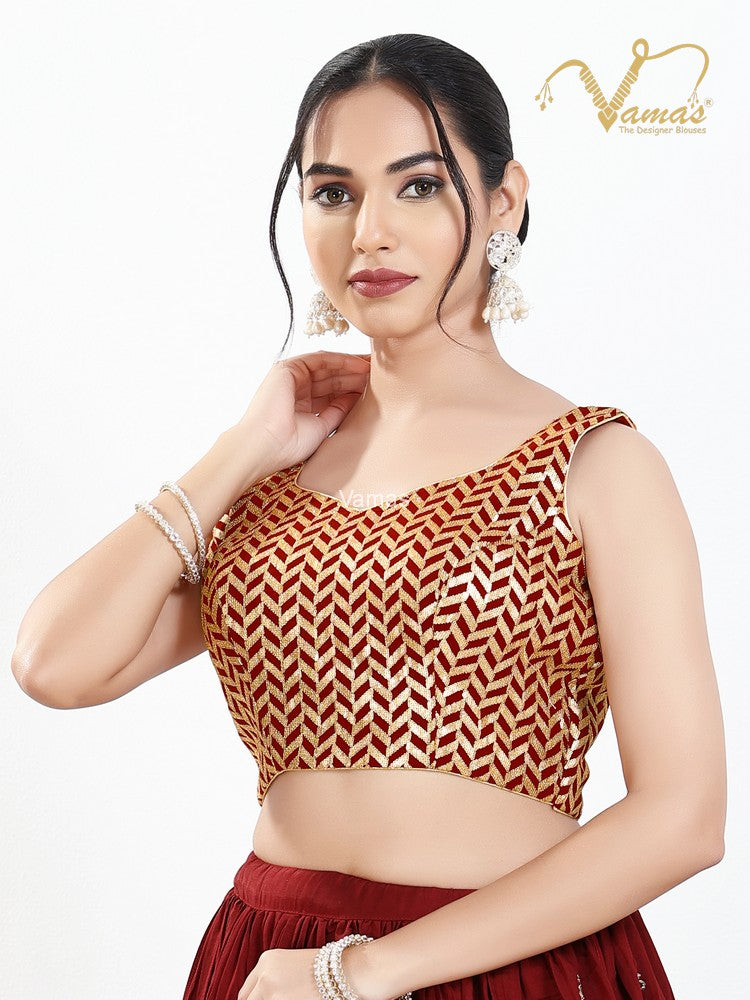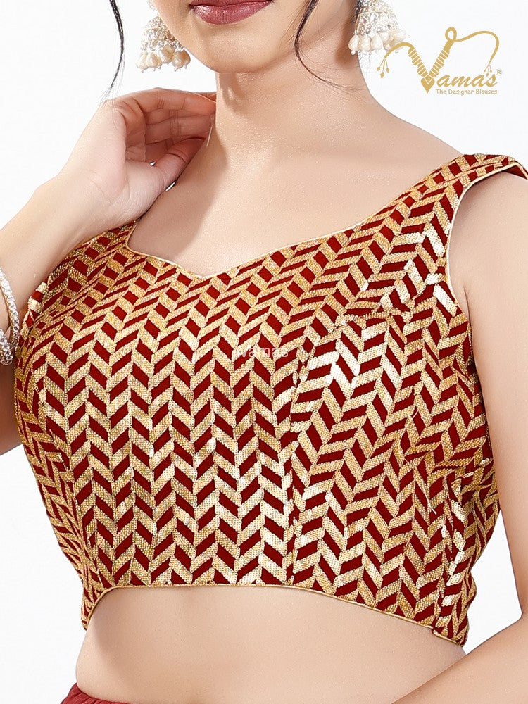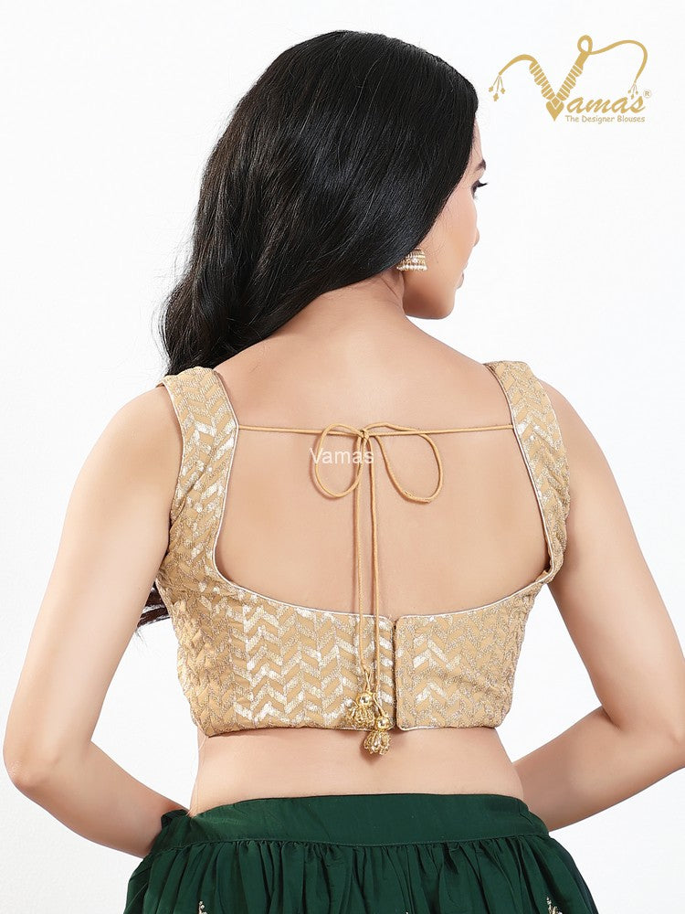 This sleeveless saree blouse features intricate sequence zig-zag embroidery on a soft georgette fabric. The unique paan neck design adds a touch of classic charm, making it a perfect match for any elegant saree., This Is A Fully Stitched Ready-Made Padded Saree Blouse With No Sleeves, Size Tip: We recommend buying a size bigger than your actual inner garment size (If your size is 32, then go for 34), 3 Openable Margin Stitches Of Approx. 2 Inches Available On Both Sides For Any Future Alterations, Care Instruction : Dry Clean Only.