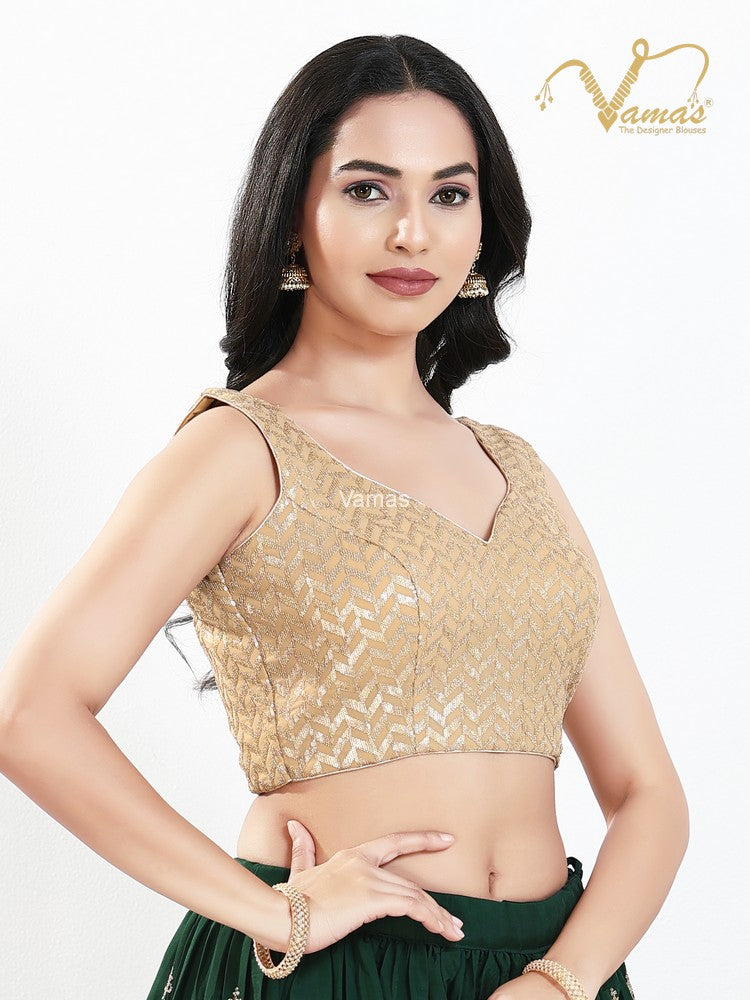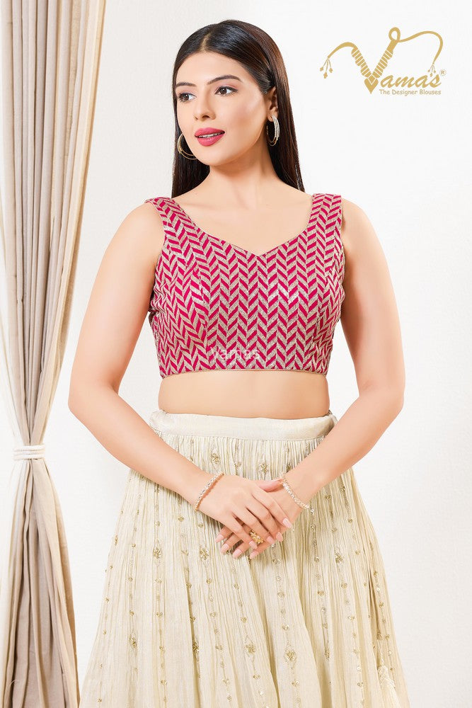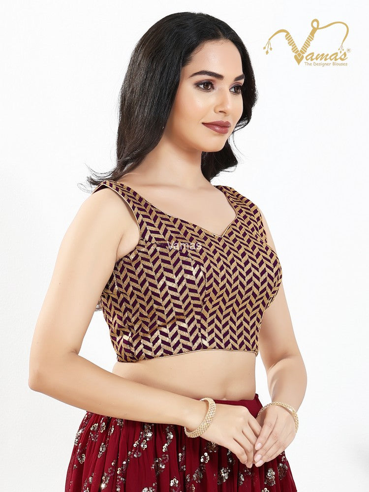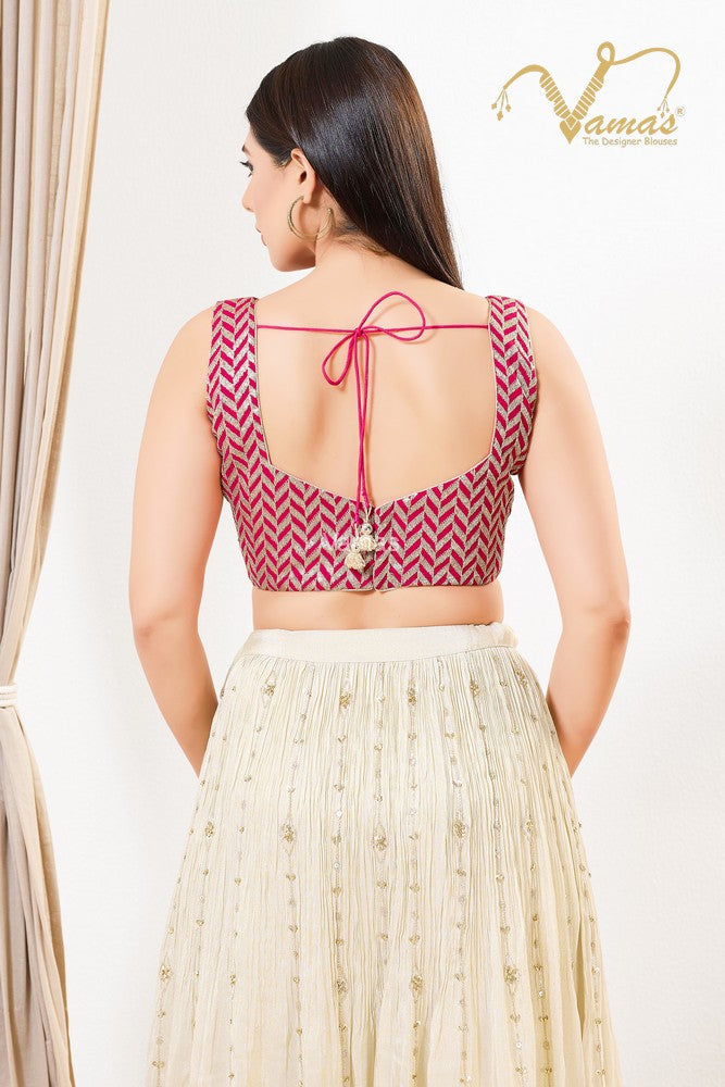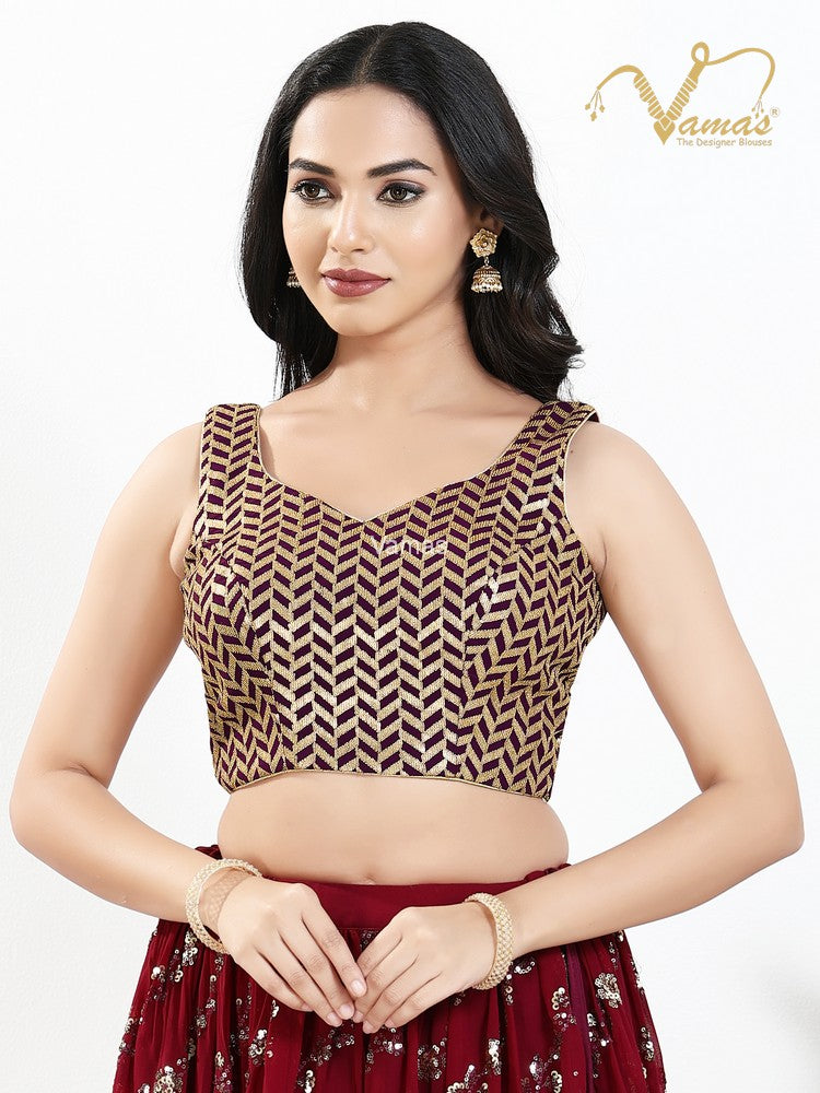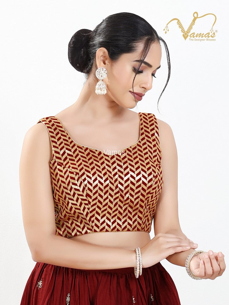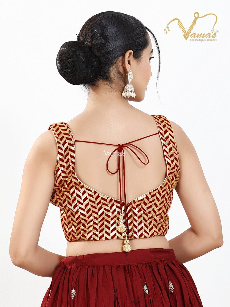 This sleeveless saree blouse features intricate sequence zig-zag embroidery on a soft georgette fabric. The unique paan neck design adds a touch of classic charm, making it a perfect match for any elegant saree., This Is A Fully Stitched Ready-Made Padded Saree Blouse With No Sleeves, Size Tip: We recommend buying a size bigger than your actual inner garment size (If your size is 32, then go for 34), 3 Openable Margin Stitches Of Approx. 2 Inches Available On Both Sides For Any Future Alterations, Care Instruction : Dry Clean Only.
