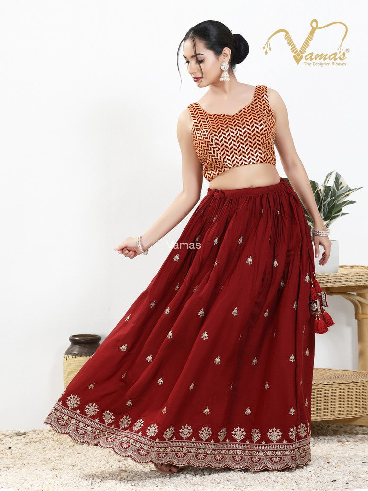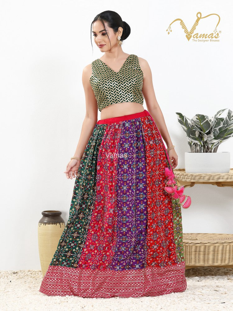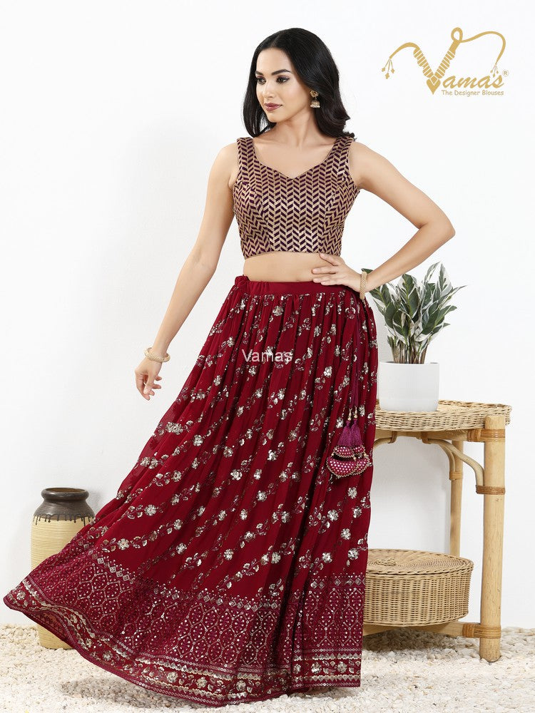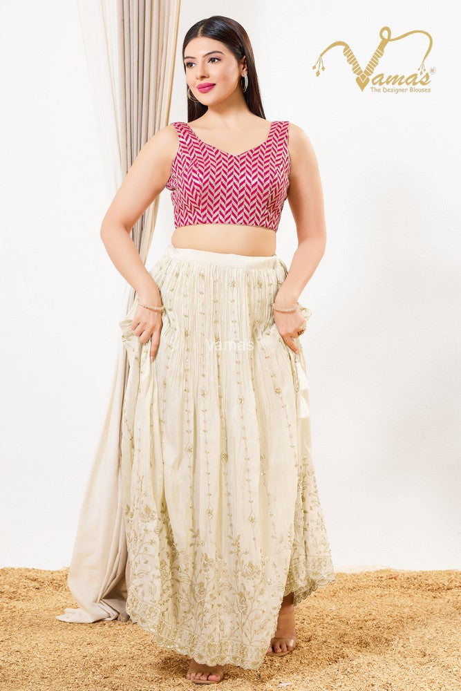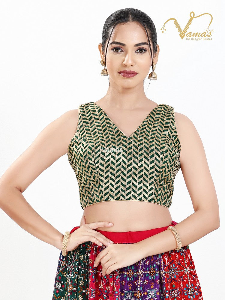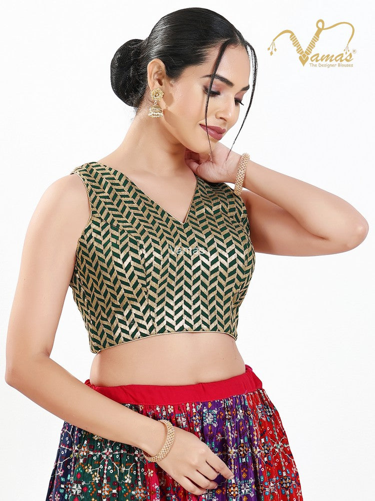 This sleeveless saree blouse features intricate sequence zig-zag embroidery on a soft georgette fabric. The unique paan neck design adds a touch of classic charm, making it a perfect match for any elegant saree., This Is A Fully Stitched Ready-Made Padded Saree Blouse With No Sleeves, Size Tip: We recommend buying a size bigger than your actual inner garment size (If your size is 32, then go for 34), 3 Openable Margin Stitches Of Approx. 2 Inches Available On Both Sides For Any Future Alterations, Care Instruction : Dry Clean Only.