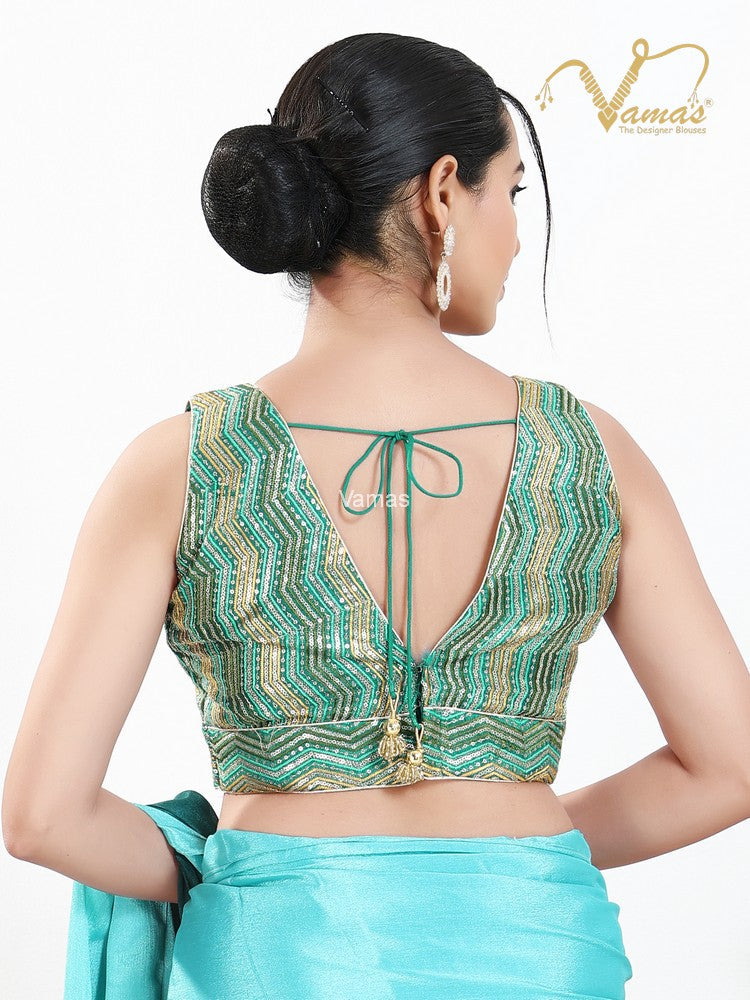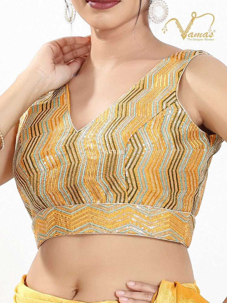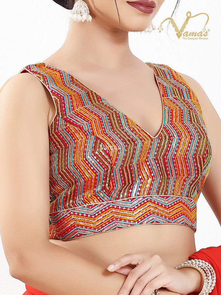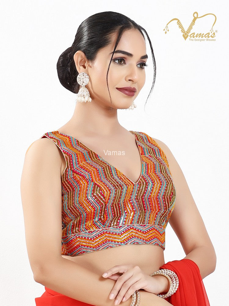 This sleeveless V-neck blouse makes a vibrant statement. It features a striking multicolored zig-zag pattern crafted with intricate thread and zari embroidery. The unique yoke detail at the waist offers a flattering, tailored fit., This Is A Fully Stitched Ready-Made Padded Saree Blouse With No Sleeves, Size Tip: We recommend buying a size bigger than your actual inner garment size (If your size is 32, then go for 34), 3 Openable Margin Stitches Of Approx. 2 Inches Available On Both Sides For Any Future Alterations, Care Instruction : Dry Clean Only.