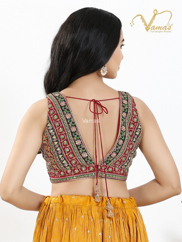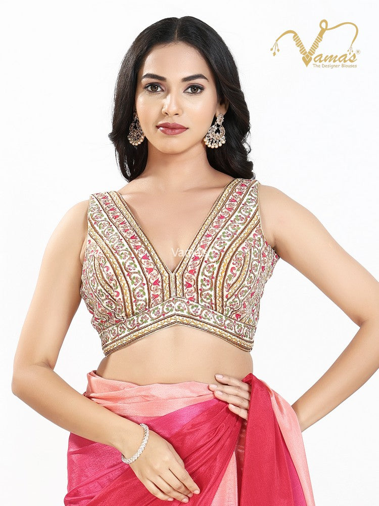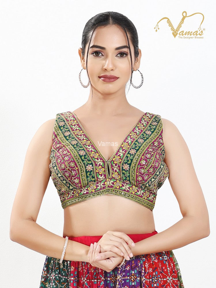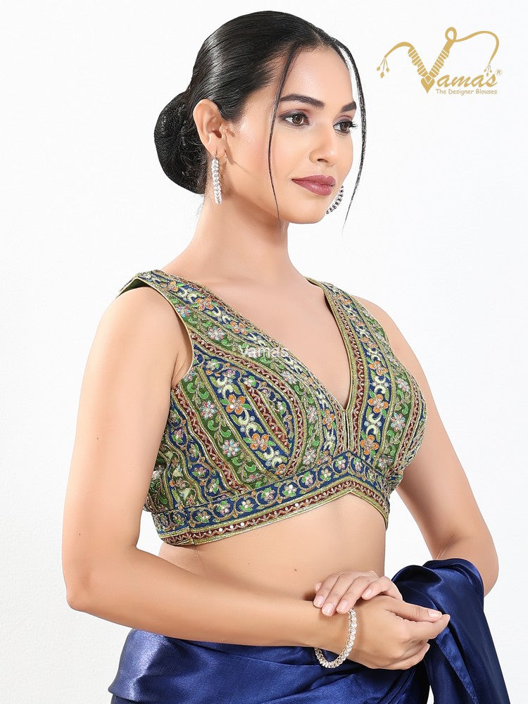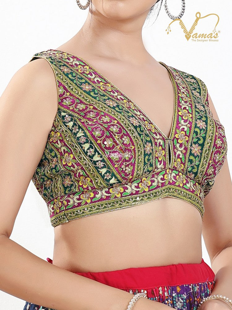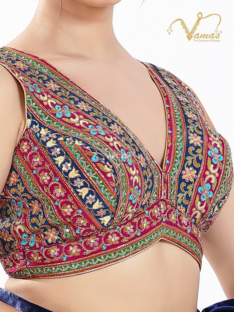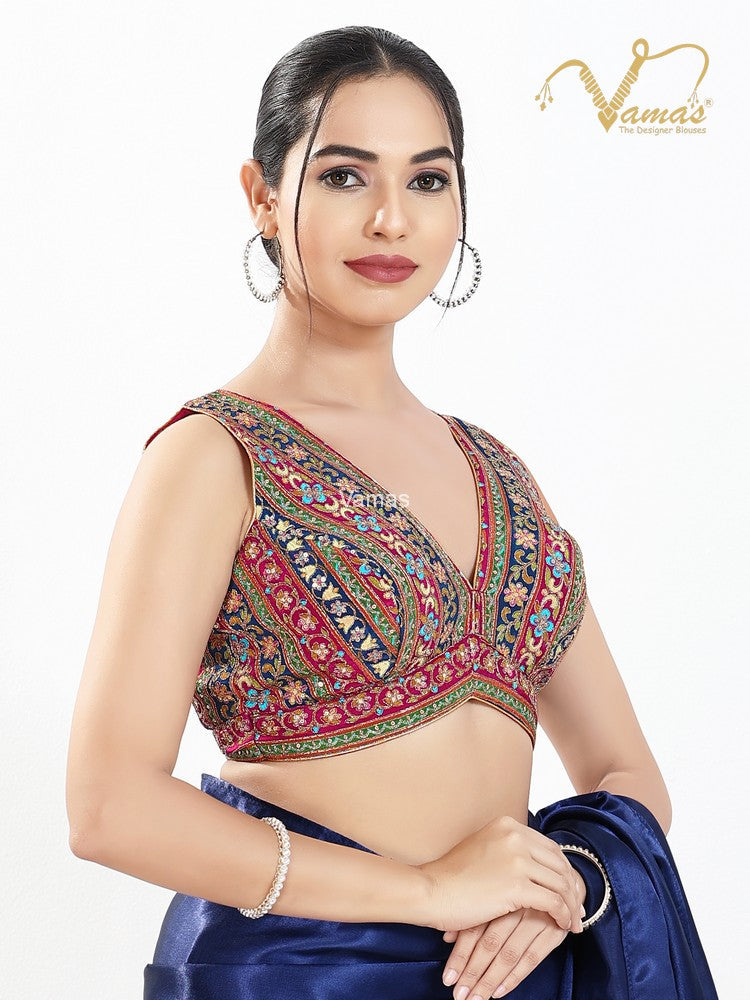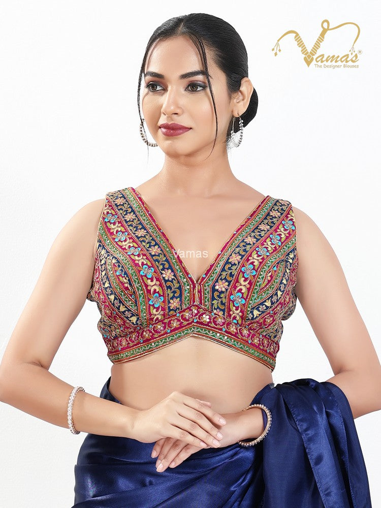 Elevate your look with this vibrant sleeveless V-neck blouse, a burst of color in position-printed embroidered fabric. The flattering waist yoke detail cinches the silhouette, making it an effortlessly chic and unique statement piece. Perfect for adding artistic flair to any ensemble, day or night., This Is A Fully Stitched Ready-Made Padded Saree Blouse With No Sleeves, Size Tip: We recommend buying a size bigger than your actual inner garment size (If your size is 32, then go for 34), 3 Openable Margin Stitches Of Approx. 2 Inches Available On Both Sides For Any Future Alterations, Care Instruction : Dry Clean Only.