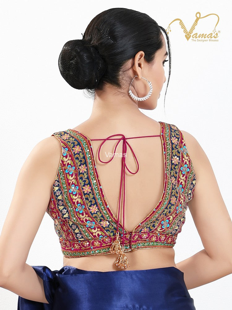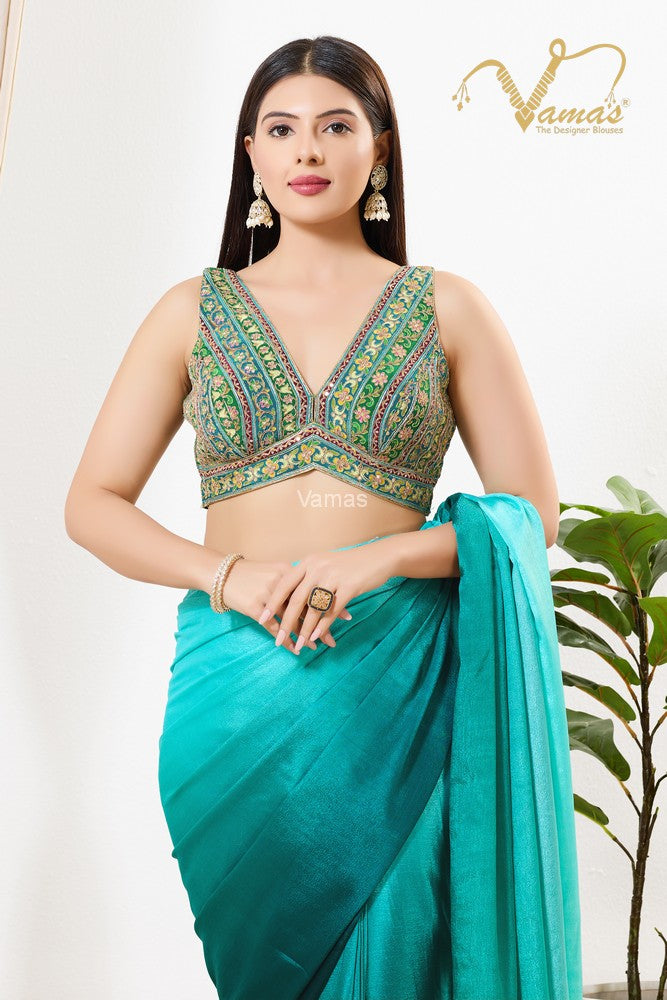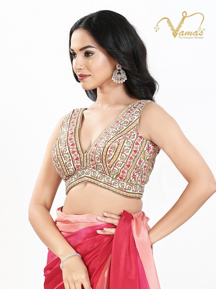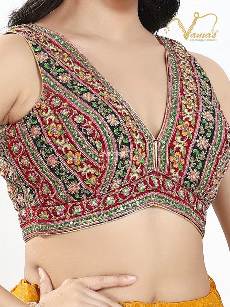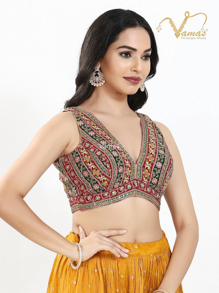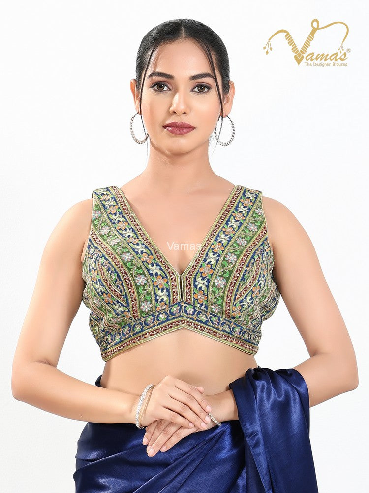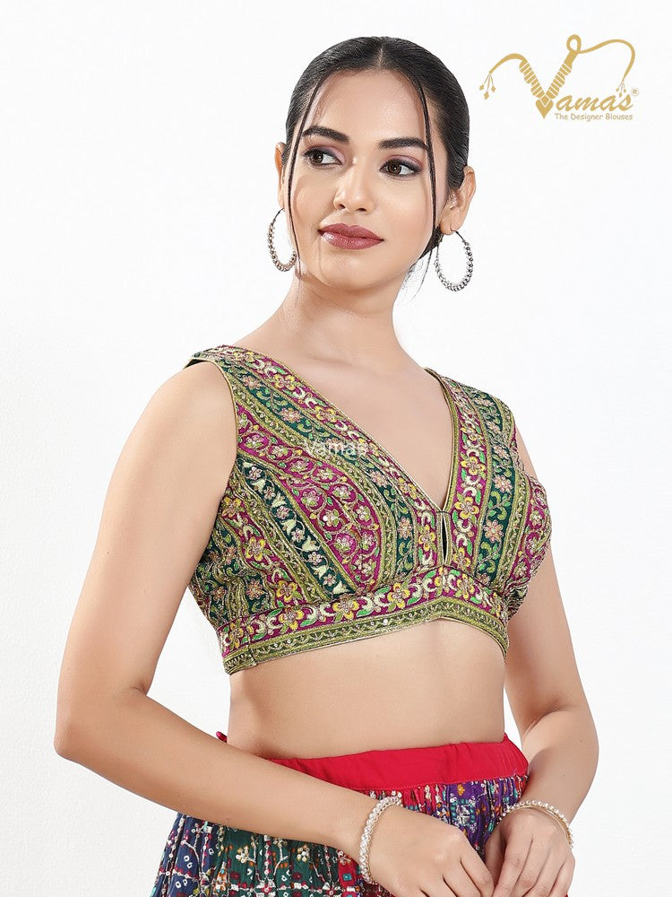 Elevate your look with this vibrant sleeveless V-neck blouse, a burst of color in position-printed embroidered fabric. The flattering waist yoke detail cinches the silhouette, making it an effortlessly chic and unique statement piece. Perfect for adding artistic flair to any ensemble, day or night., This Is A Fully Stitched Ready-Made Padded Saree Blouse With No Sleeves, Size Tip: We recommend buying a size bigger than your actual inner garment size (If your size is 32, then go for 34), 3 Openable Margin Stitches Of Approx. 2 Inches Available On Both Sides For Any Future Alterations, Care Instruction : Dry Clean Only.