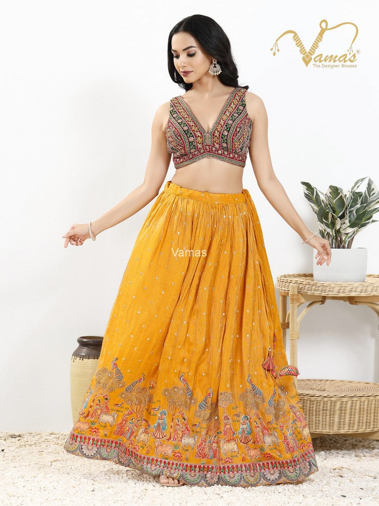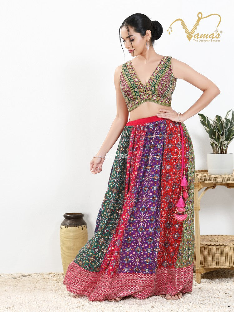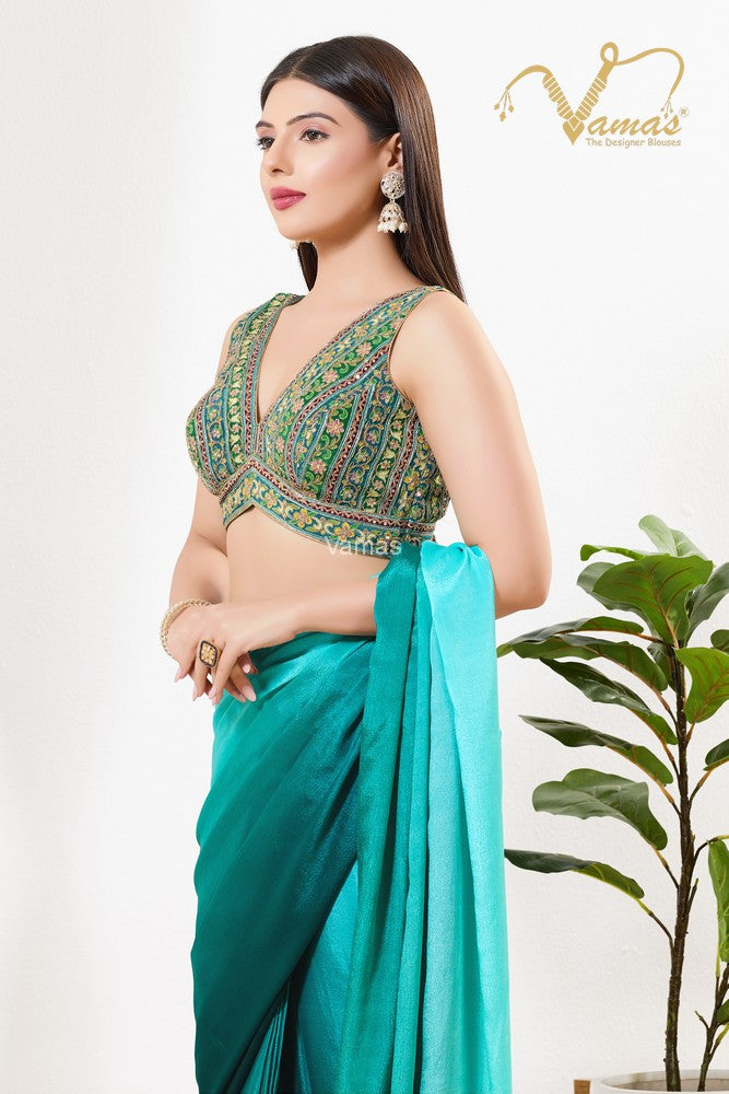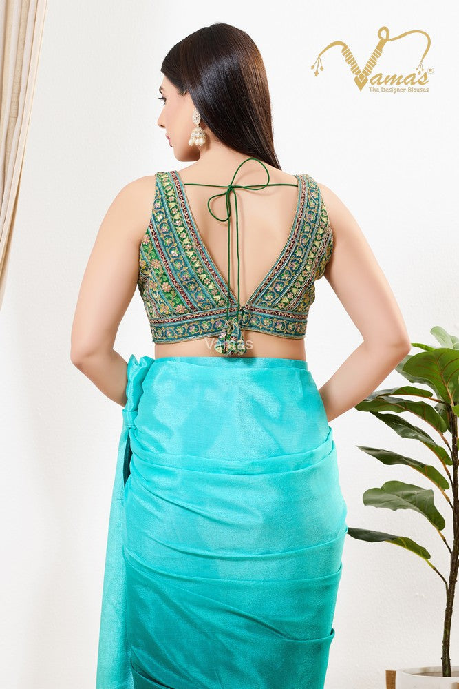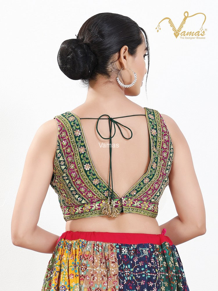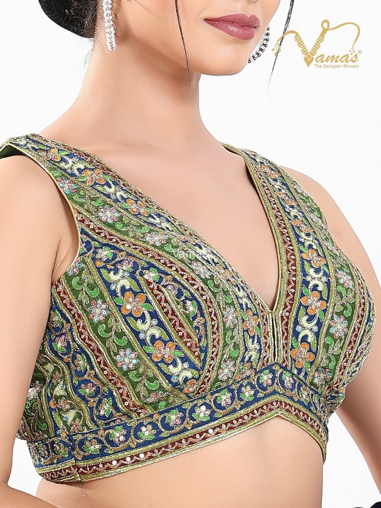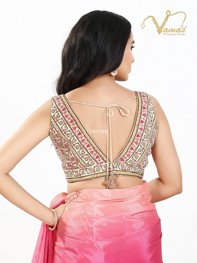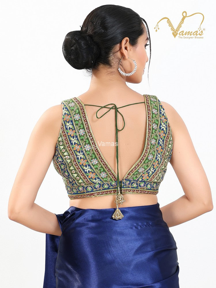 Elevate your look with this vibrant sleeveless V-neck blouse, a burst of color in position-printed embroidered fabric. The flattering waist yoke detail cinches the silhouette, making it an effortlessly chic and unique statement piece. Perfect for adding artistic flair to any ensemble, day or night., This Is A Fully Stitched Ready-Made Padded Saree Blouse With No Sleeves, Size Tip: We recommend buying a size bigger than your actual inner garment size (If your size is 32, then go for 34), 3 Openable Margin Stitches Of Approx. 2 Inches Available On Both Sides For Any Future Alterations, Care Instruction : Dry Clean Only.