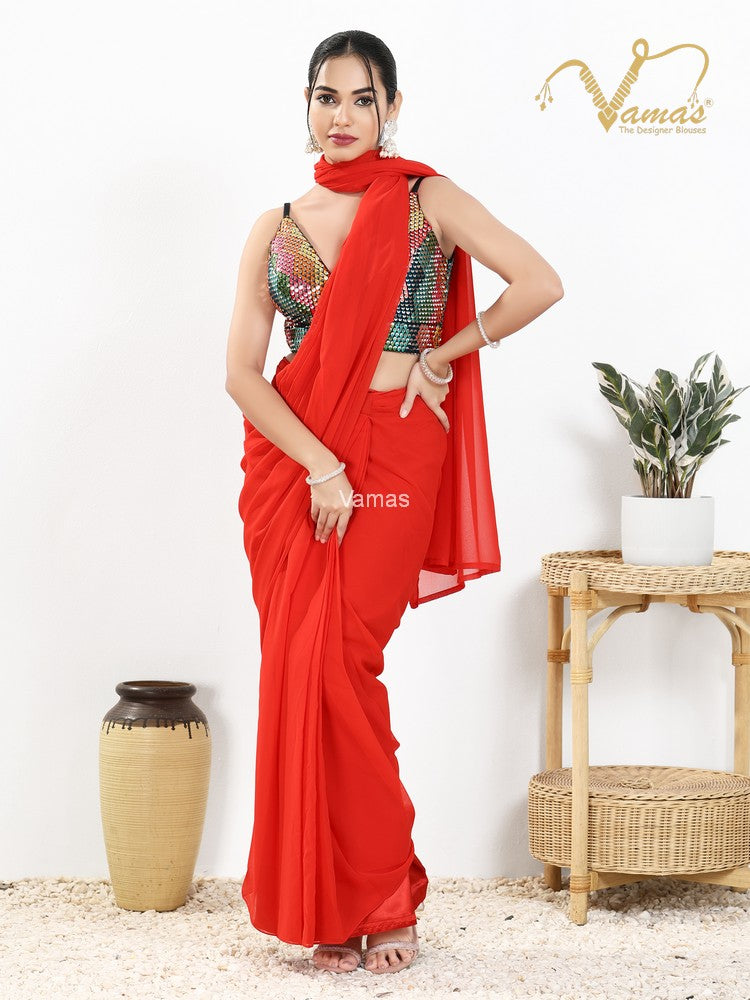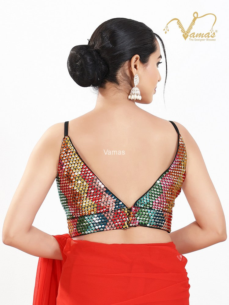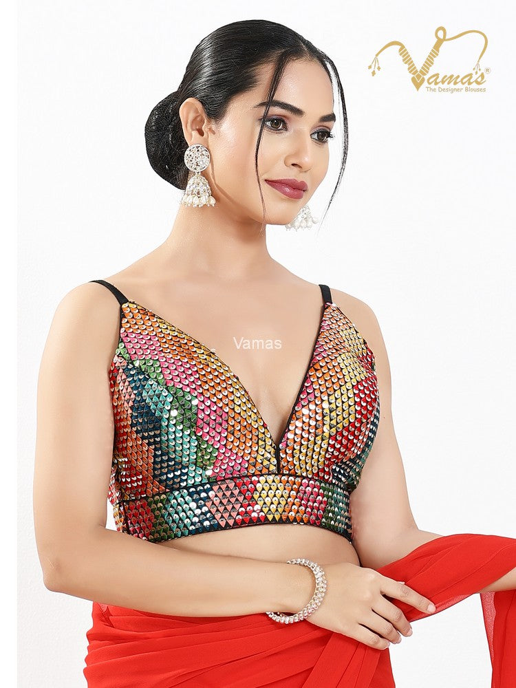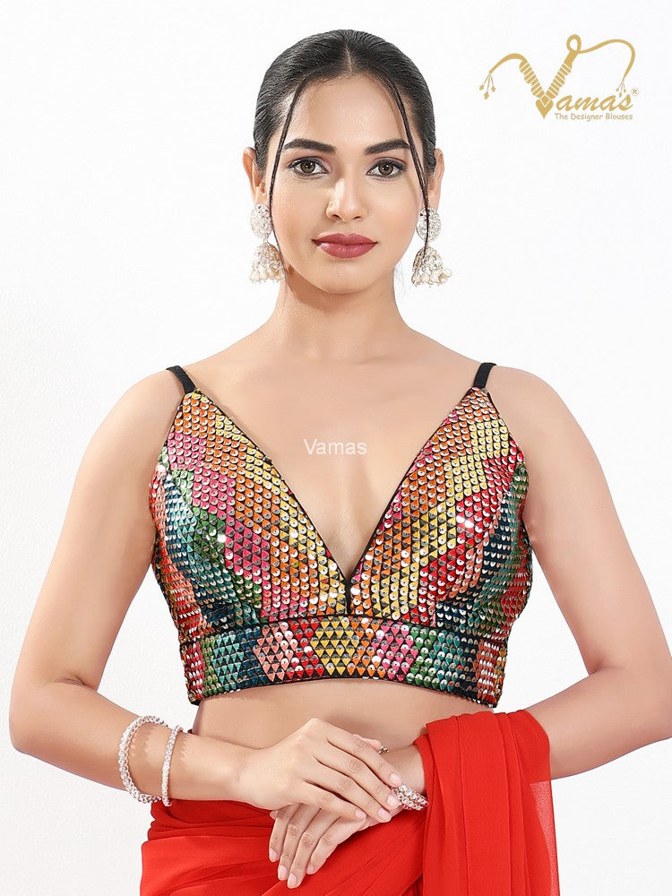 Step into the spotlight in this alluring plunging V-neck party blouse. Its intricate multicolored thread and sequin embroidery adds dazzling sparkle and texture. A chic waist yoke offers structure, keeping the spaghetti strap silhouette elegant and modern., This Is A Fully Stitched Ready-Made Padded Saree Blouse With No Sleeves, Size Tip: We recommend buying a size bigger than your actual inner garment size (If your size is 32, then go for 34), 3 Openable Margin Stitches Of Approx. 2 Inches Available On Both Sides For Any Future Alterations, Care Instruction : Dry Clean Only.