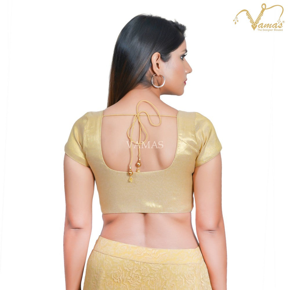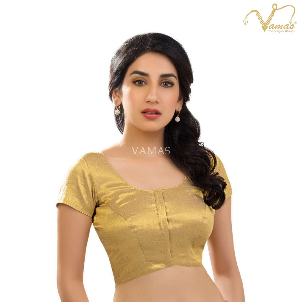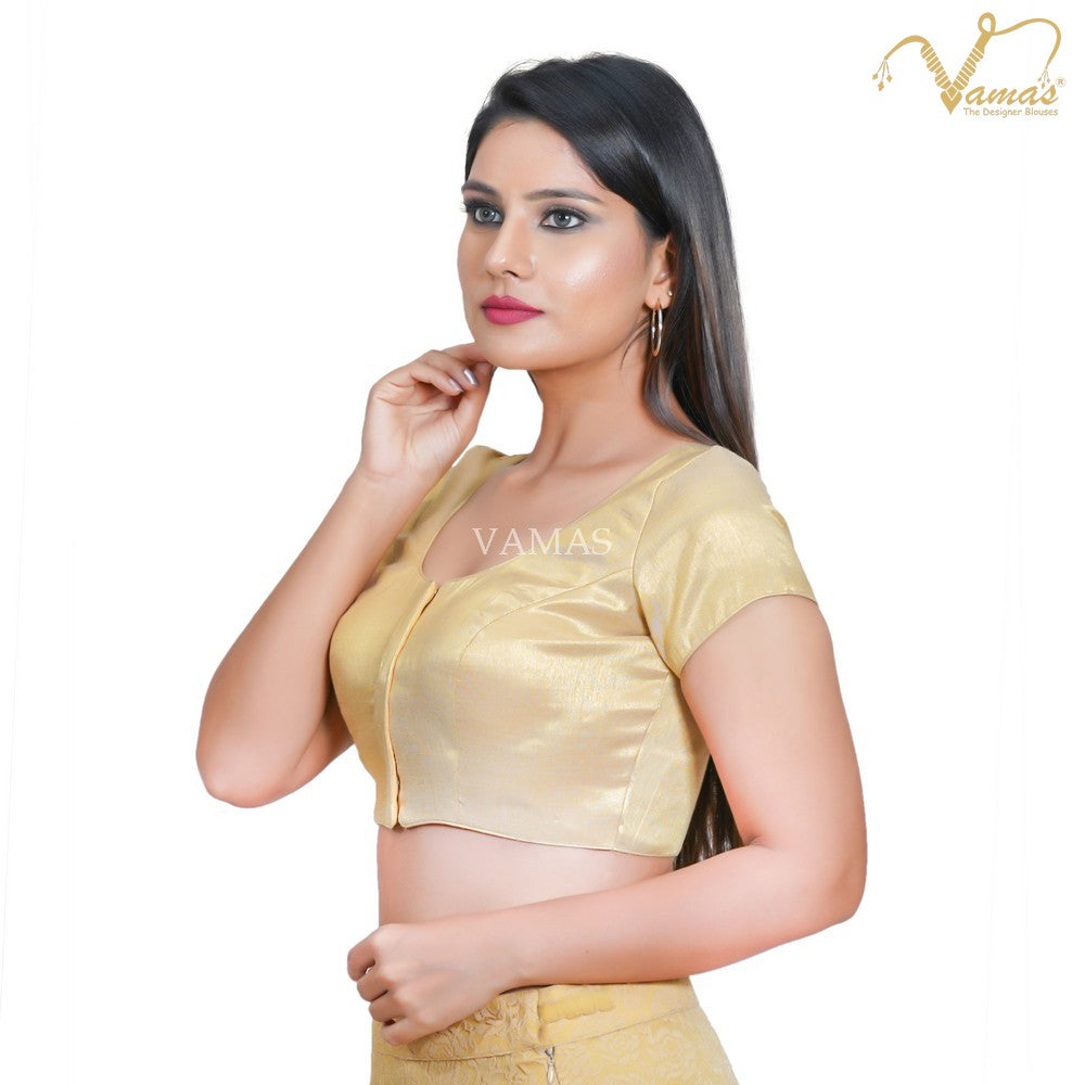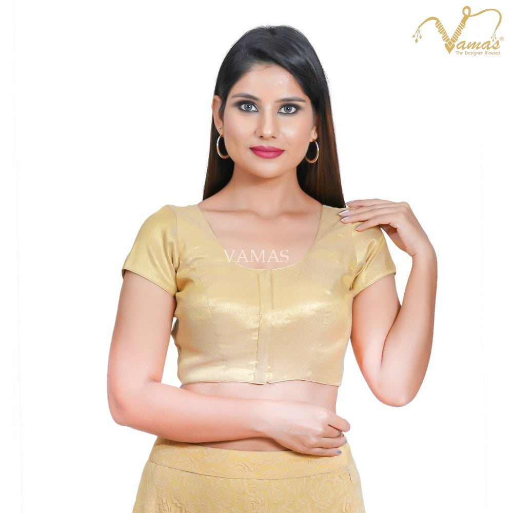 Elegant simple shimmer gold padded blouse which can be teamed up with all types of saree, This Is A Fully Stitched Ready-Made Padded Saree Blouse With Short Sleeves, Size Tip: We recommend buying a size bigger than your actual inner garment size (If your size is 32, then go for 34), 3 Openable Margin Stitches Of Approx. 2 Inches Available On Both Sides For Any Future Alterations, Care Instruction : Dry Clean Only.
