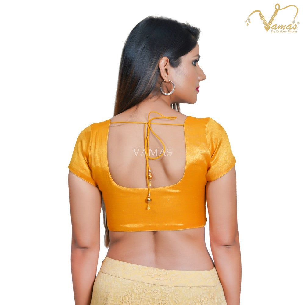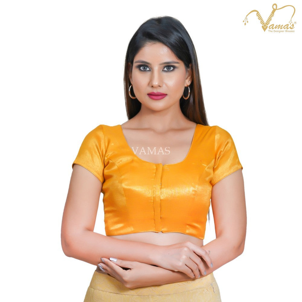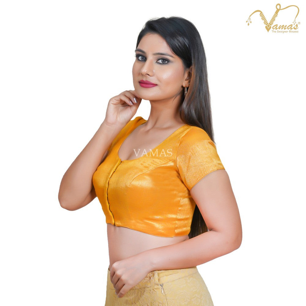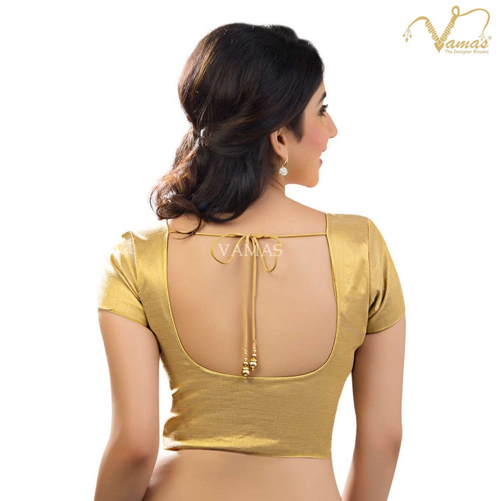 Elegant simple shimmer gold padded blouse which can be teamed up with all types of saree, This Is A Fully Stitched Ready-Made Padded Saree Blouse With Short Sleeves, Size Tip: We recommend buying a size bigger than your actual inner garment size (If your size is 32, then go for 34), 3 Openable Margin Stitches Of Approx. 2 Inches Available On Both Sides For Any Future Alterations, Care Instruction : Dry Clean Only.