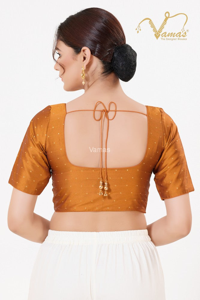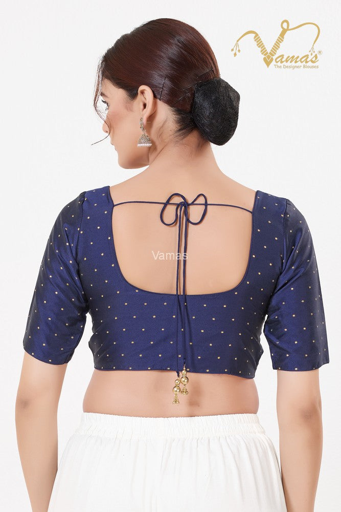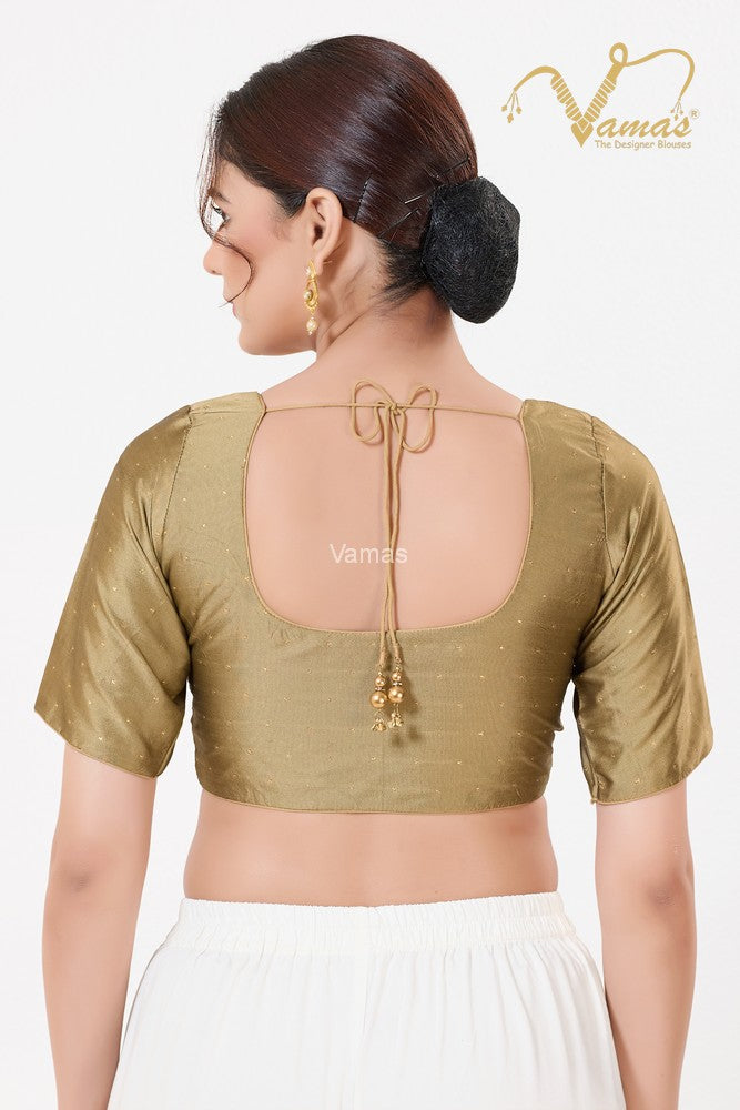 Stunning zari weved tafeta silk blouse with lace work at hems and elbow length sleeves., This Is A Fully Stitched Ready-Made Padded Saree Blouse With Elbow Sleeves, Size Tip: We recommend buying a size bigger than your actual inner garment size (If your size is 32, then go for 34), 3 Openable Margin Stitches Of Approx. 2 Inches Available On Both Sides For Any Future Alterations, Care Instruction : Dry Clean Only.
