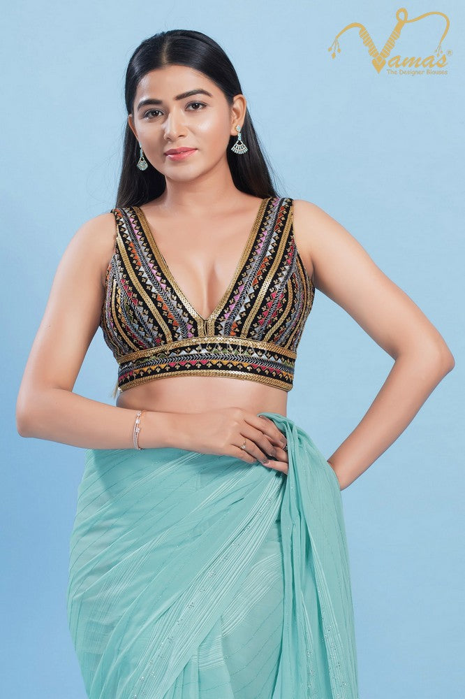 Vamas Women's Georgette Padded Back Open Sleeveless Saree Blouse, This Is A Fully Stitched Ready-Made Padded Saree Blouse With No Sleeves, Size Tip: We recommend buying a size bigger than your actual inner garment size (If your size is 32, then go for 34), 3 Openable Margin Stitches Of Approx. 2 Inches Available On Both Sides For Any Future Alterations, Care Instruction : Dry Clean Only.