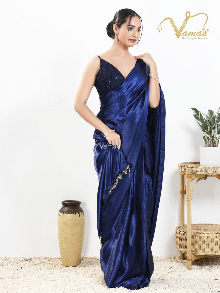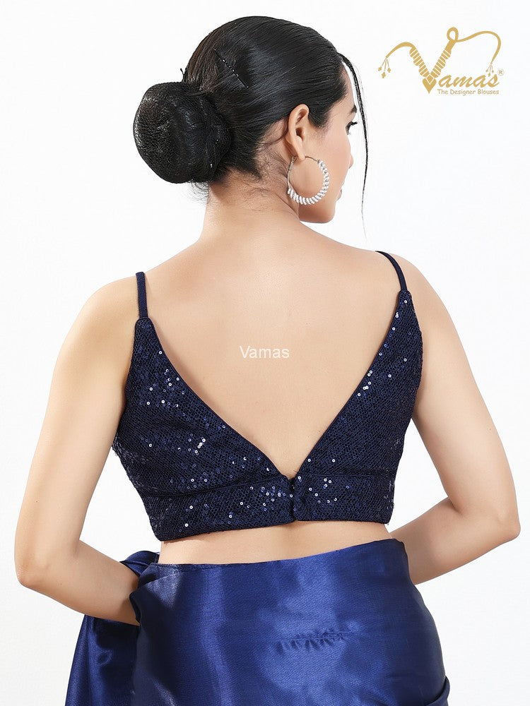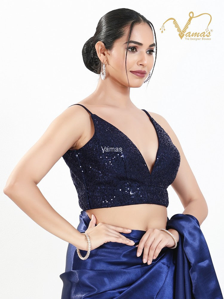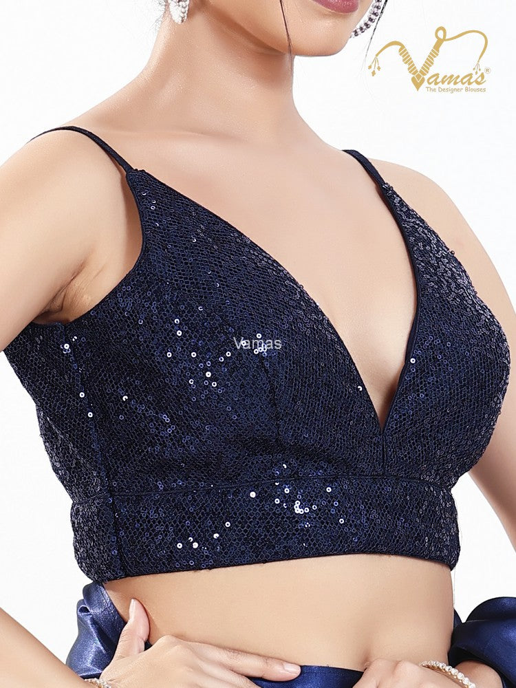 This part-wear statement blouse shines with imported sequin fabric that catches the light beautifully. It features an alluring plunging V-neckline and delicate spaghetti straps, cinched by a stylish yoke at the waist for a flattering, structured fit. It's the perfect glamorous choice for any special occasion., This Is A Fully Stitched Ready-Made Padded Saree Blouse With No Sleeves, Size Tip: We recommend buying a size bigger than your actual inner garment size (If your size is 32, then go for 34), 3 Openable Margin Stitches Of Approx. 2 Inches Available On Both Sides For Any Future Alterations, Care Instruction : Dry Clean Only.