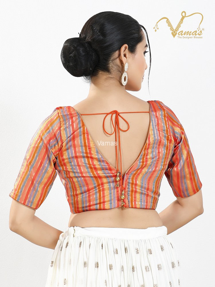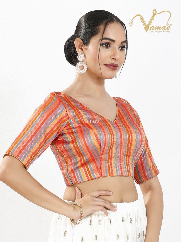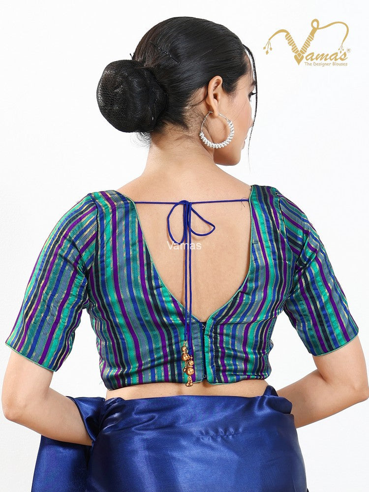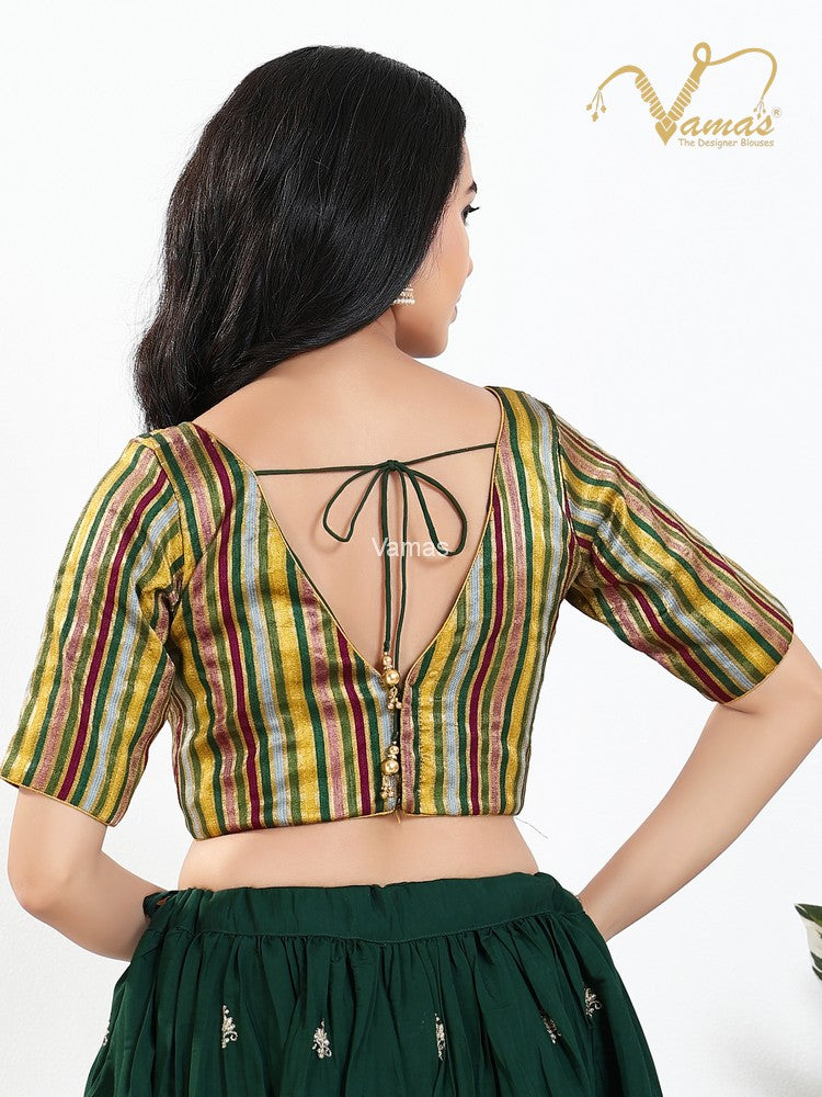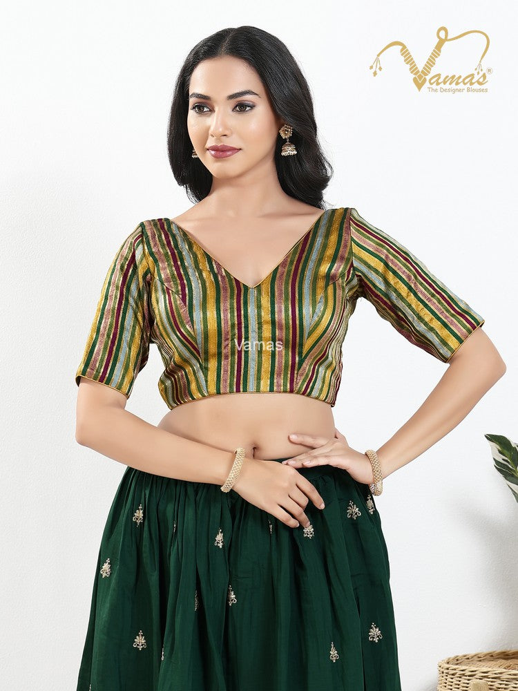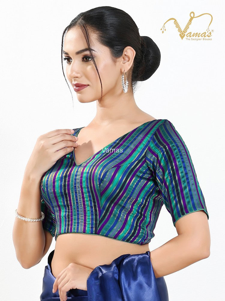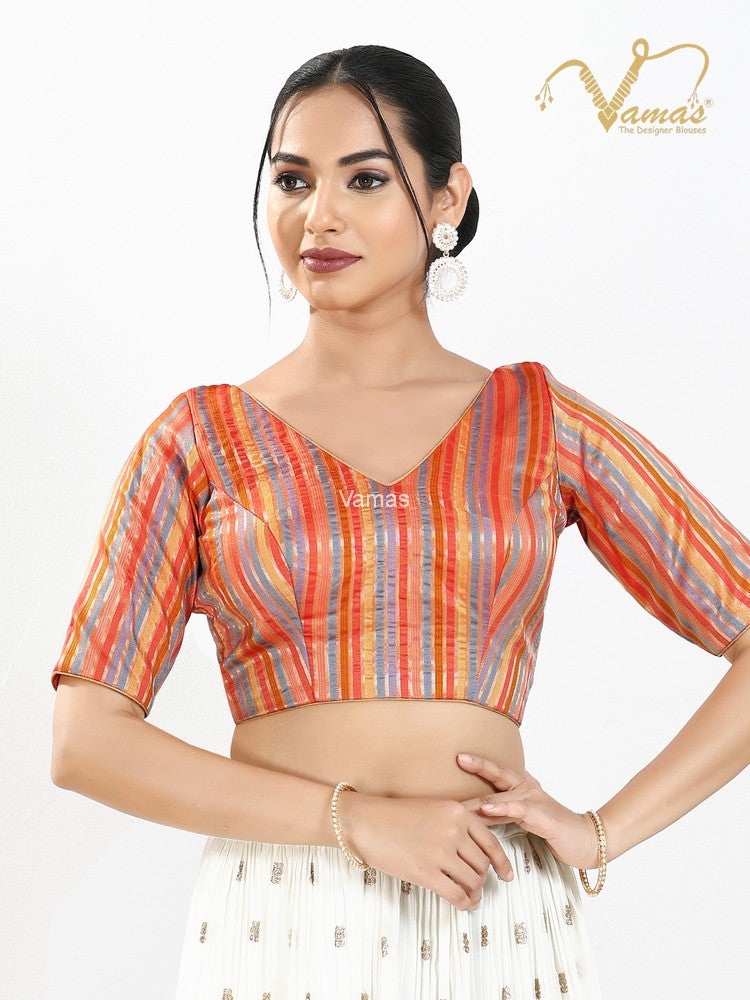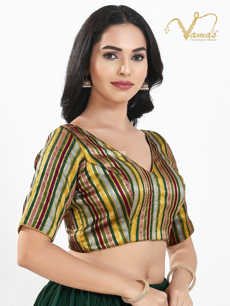 Add a pop of color to your saree with this vibrant, multicolored brocade striped blouse. Featuring a flattering V-neckline and classic elbow-length sleeves., This Is A Fully Stitched Ready-Made Padded Saree Blouse With Elbow Sleeves, Size Tip: We recommend buying a size bigger than your actual inner garment size (If your size is 32, then go for 34), 3 Openable Margin Stitches Of Approx. 2 Inches Available On Both Sides For Any Future Alterations, Care Instruction : Dry Clean Only.