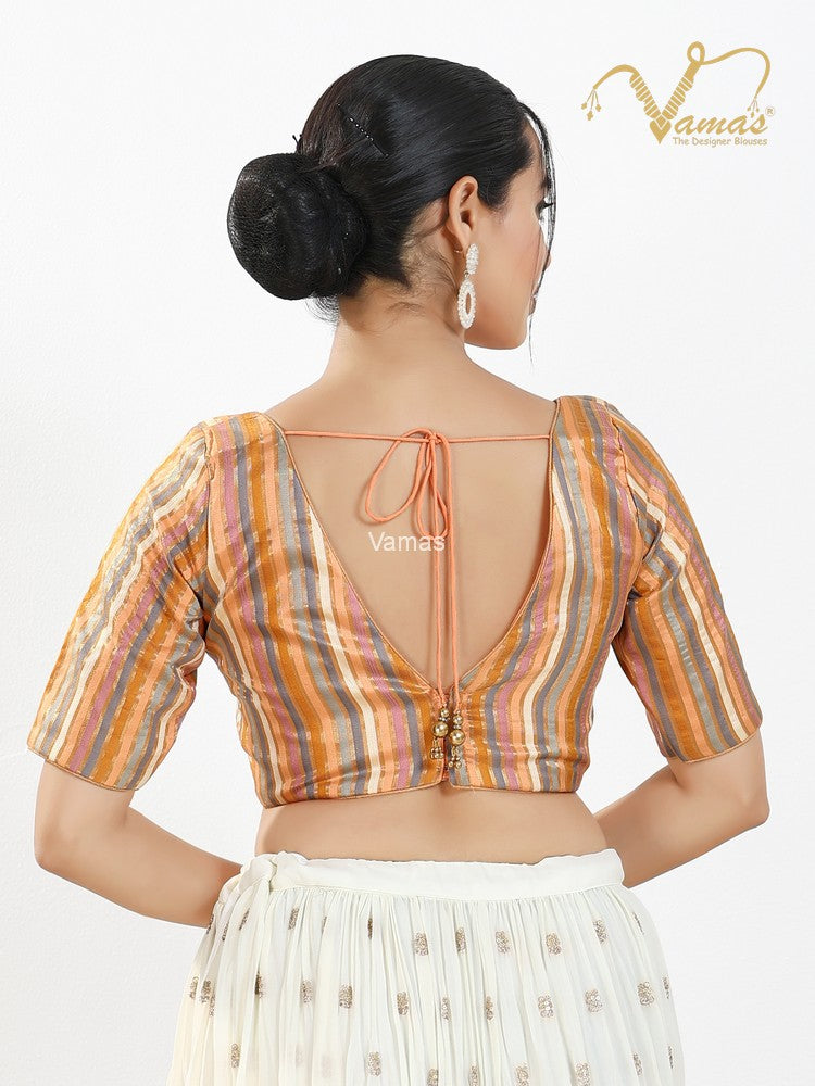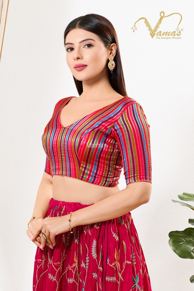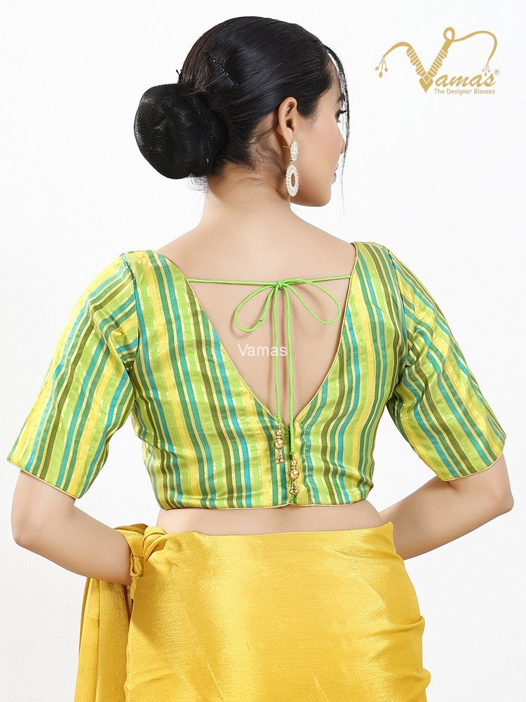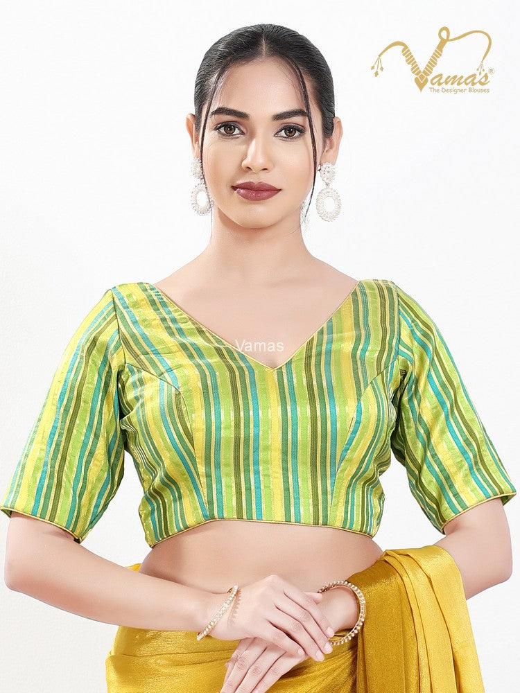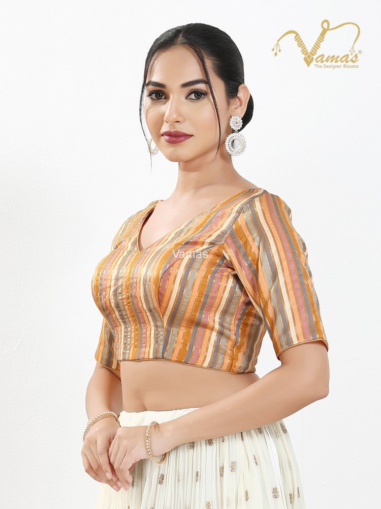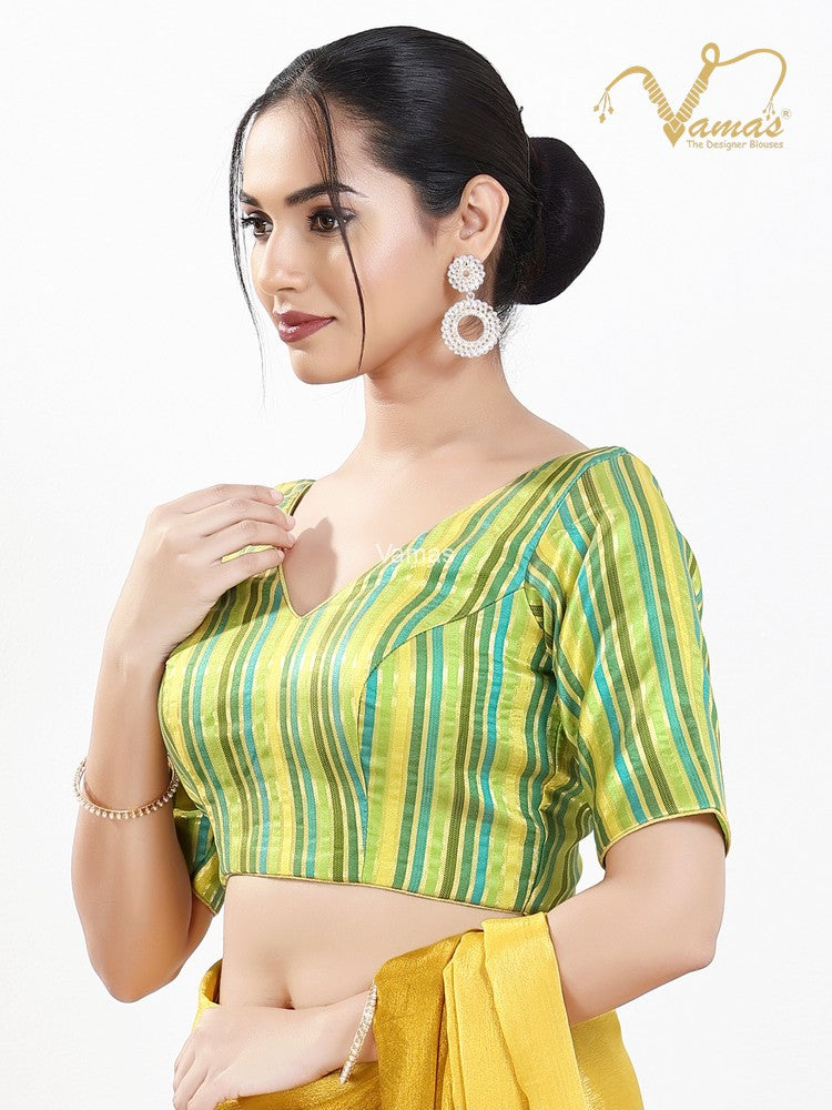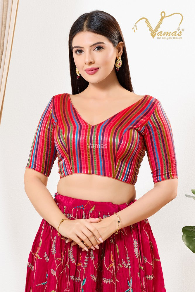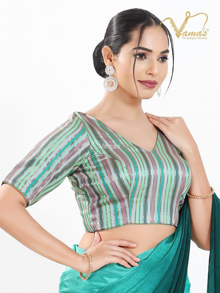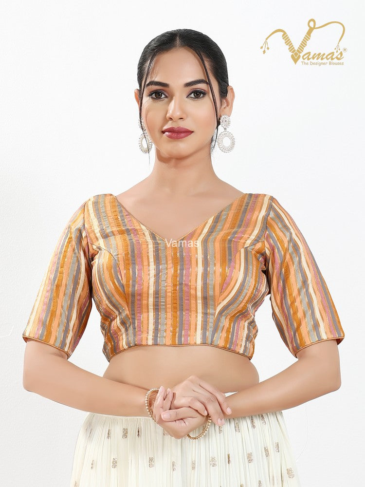 Add a pop of color to your saree with this vibrant, multicolored brocade striped blouse. Featuring a flattering V-neckline and classic elbow-length sleeves., This Is A Fully Stitched Ready-Made Padded Saree Blouse With Elbow Sleeves, Size Tip: We recommend buying a size bigger than your actual inner garment size (If your size is 32, then go for 34), 3 Openable Margin Stitches Of Approx. 2 Inches Available On Both Sides For Any Future Alterations, Care Instruction : Dry Clean Only.
