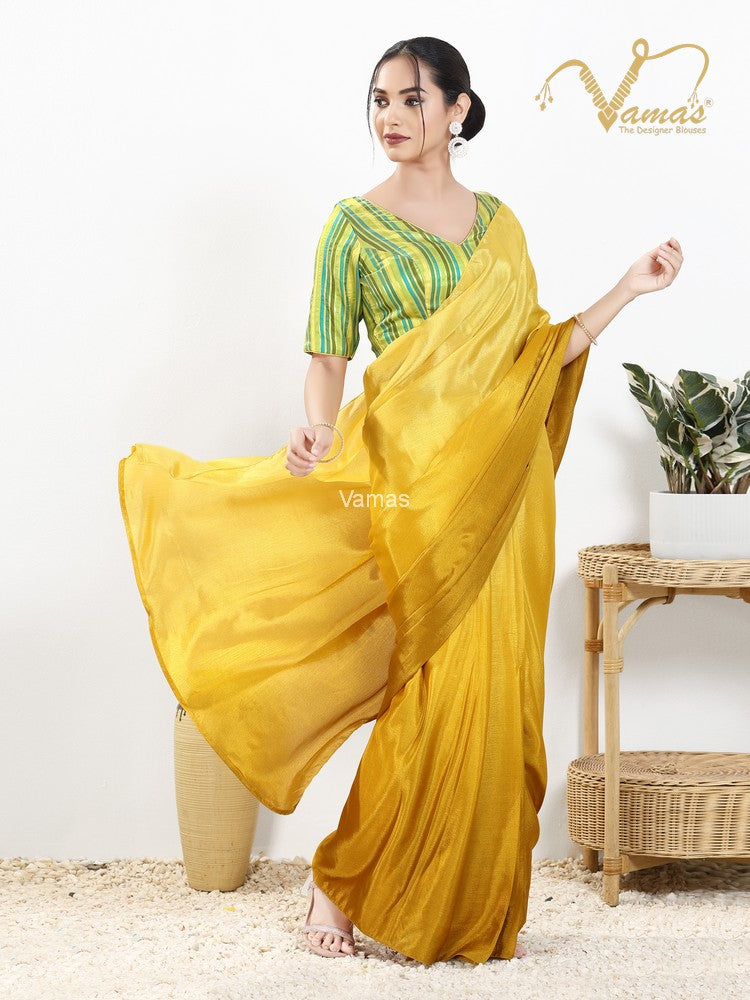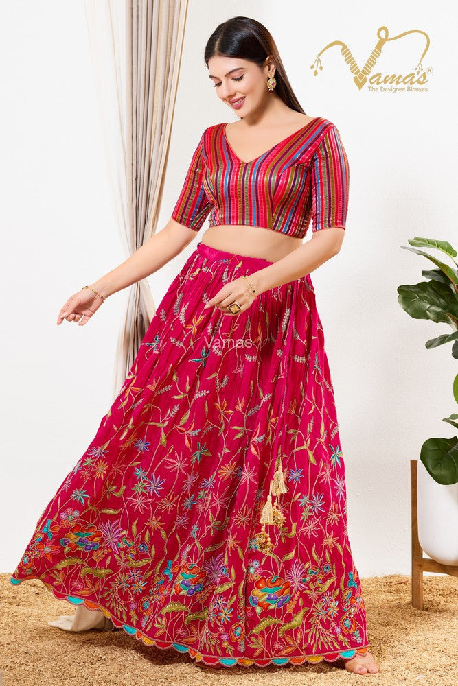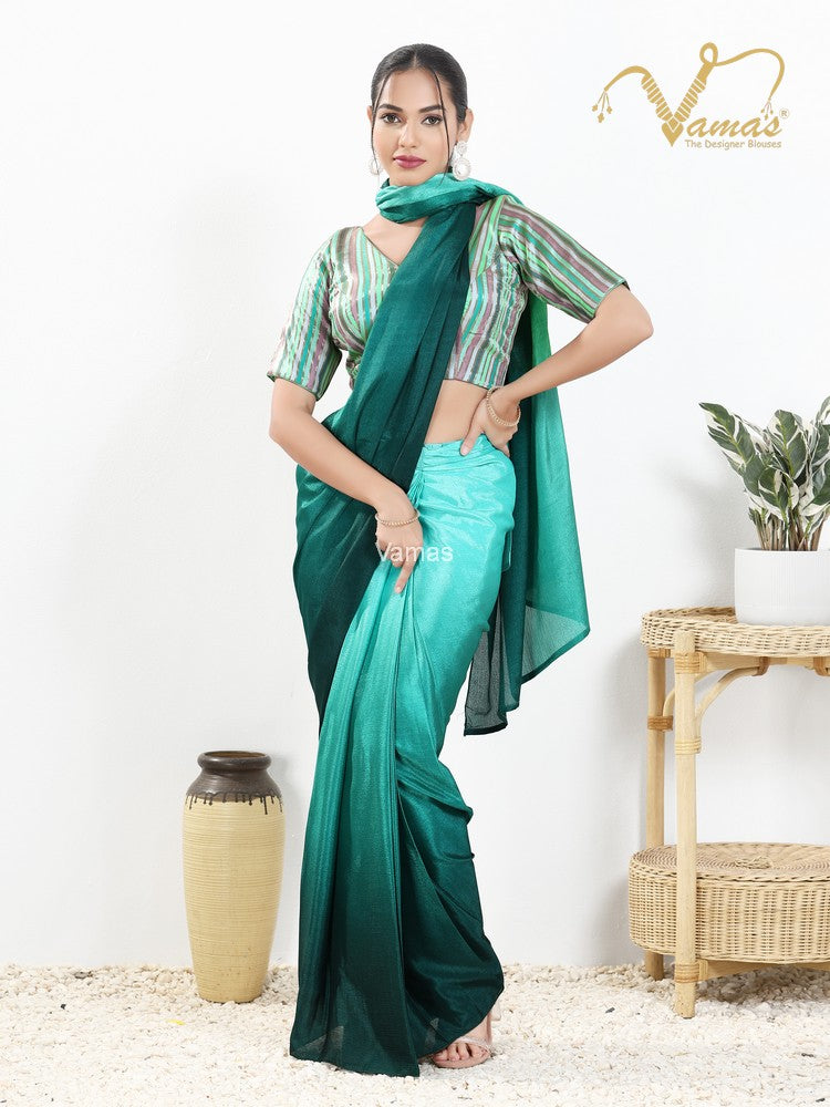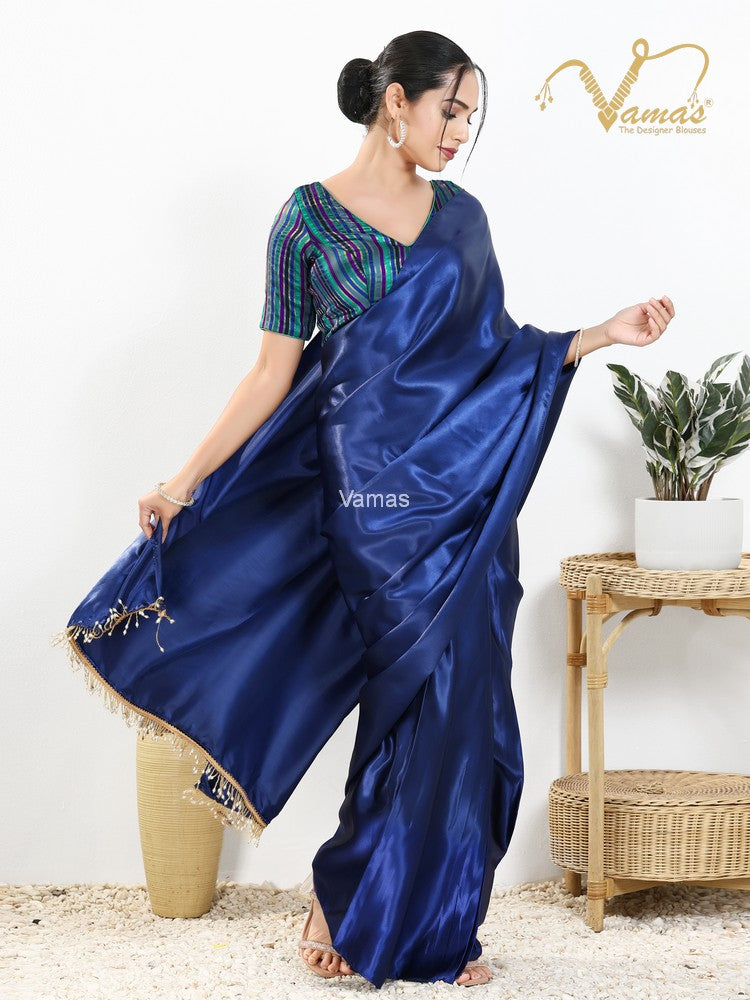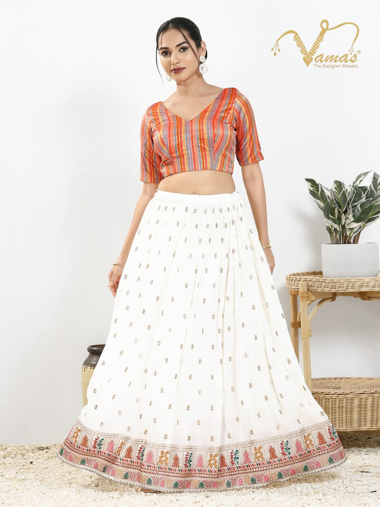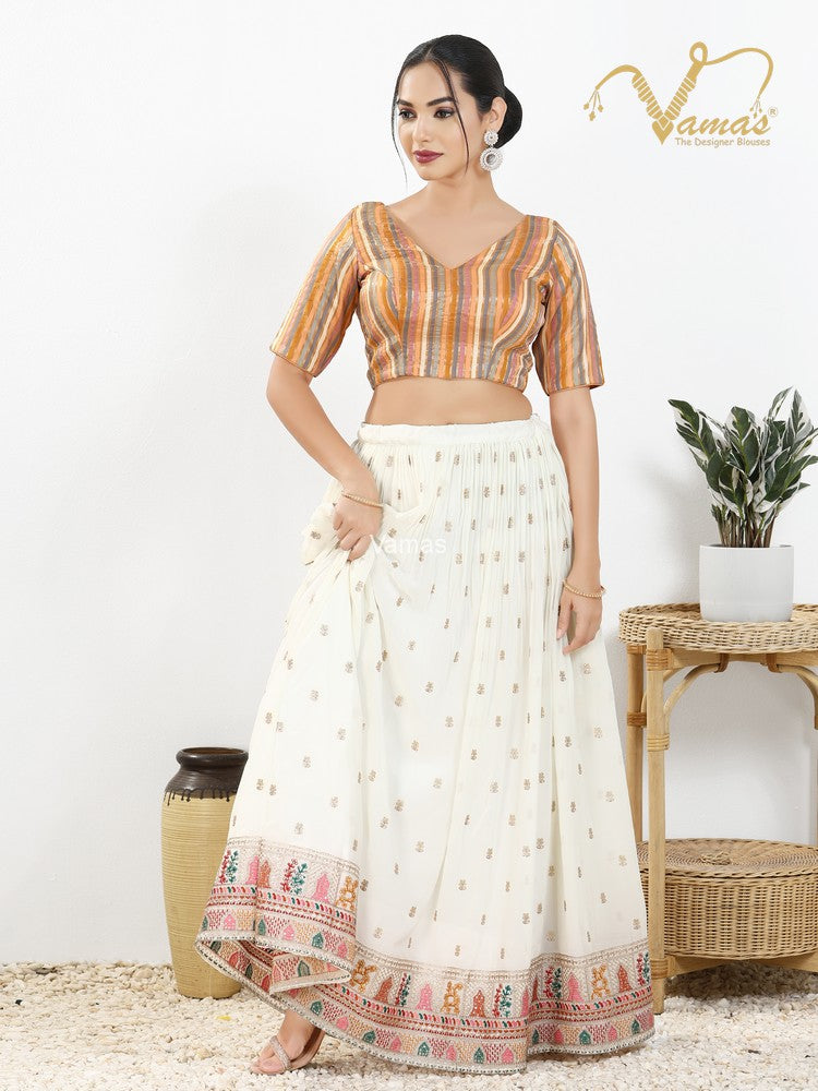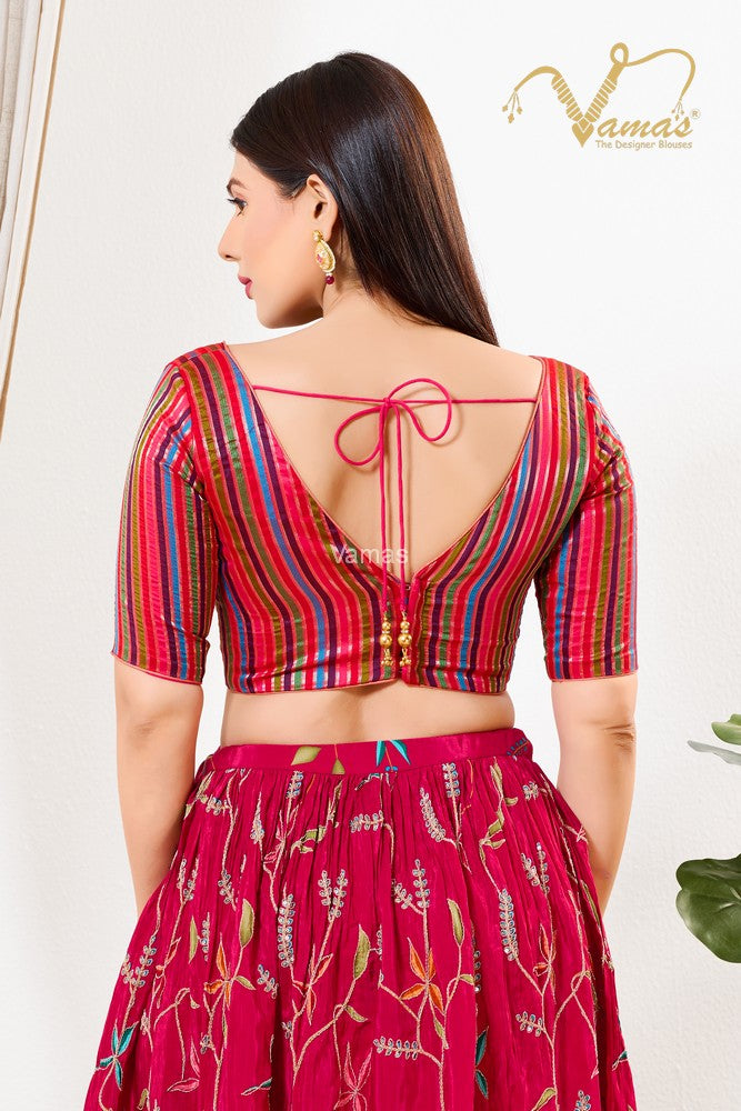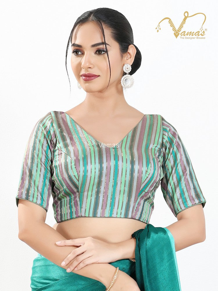 Add a pop of color to your saree with this vibrant, multicolored brocade striped blouse. Featuring a flattering V-neckline and classic elbow-length sleeves., This Is A Fully Stitched Ready-Made Padded Saree Blouse With Elbow Sleeves, Size Tip: We recommend buying a size bigger than your actual inner garment size (If your size is 32, then go for 34), 3 Openable Margin Stitches Of Approx. 2 Inches Available On Both Sides For Any Future Alterations, Care Instruction : Dry Clean Only.